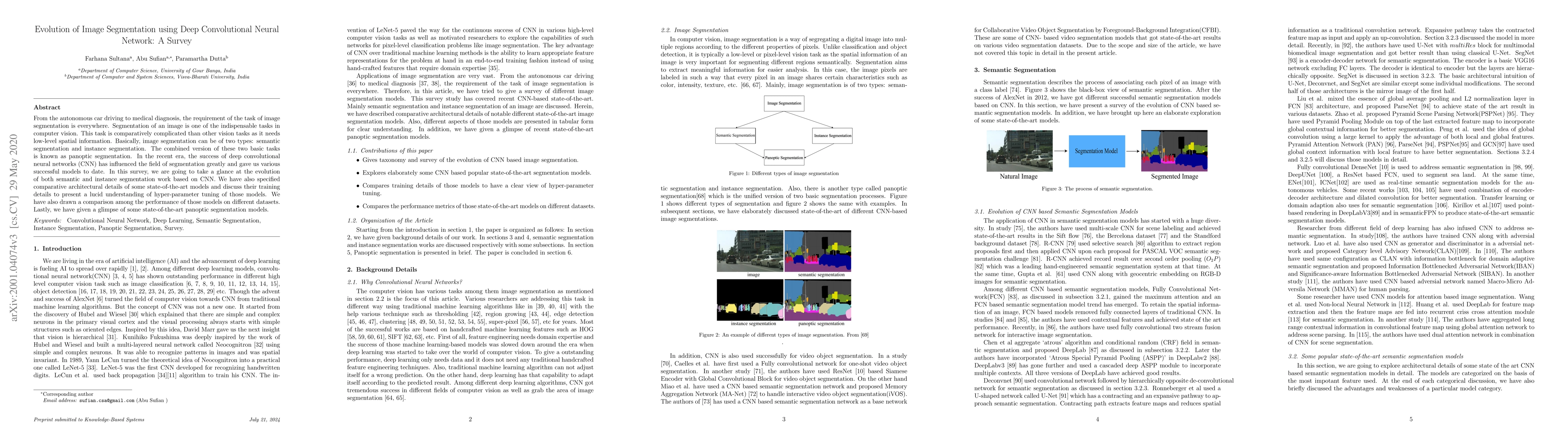 From the autonomous car driving to medical diagnosis, the requirement of the task of image segmentation is everywhere. Segmentation of an image is one of the indispensable tasks in computer vision. This task is comparatively complicated than other vision tasks as it needs low-level spatial information. Basically, image segmentation can be of two types: semantic segmentation and instance segmentation. The combined version of these two basic tasks is known as panoptic segmentation. In the recent era, the success of deep convolutional neural networks (CNN) has influenced the field of segmentation greatly and gave us various successful models to date. In this survey, we are going to take a glance at the evolution of both semantic and instance segmentation work based on CNN. We have also specified comparative architectural details of some state-of-the-art models and discuss their training details to present a lucid understanding of hyper-parameter tuning of those models. We have also drawn a comparison among the performance of those models on different datasets. Lastly, we have given a glimpse of some state-of-the-art panoptic segmentation models.