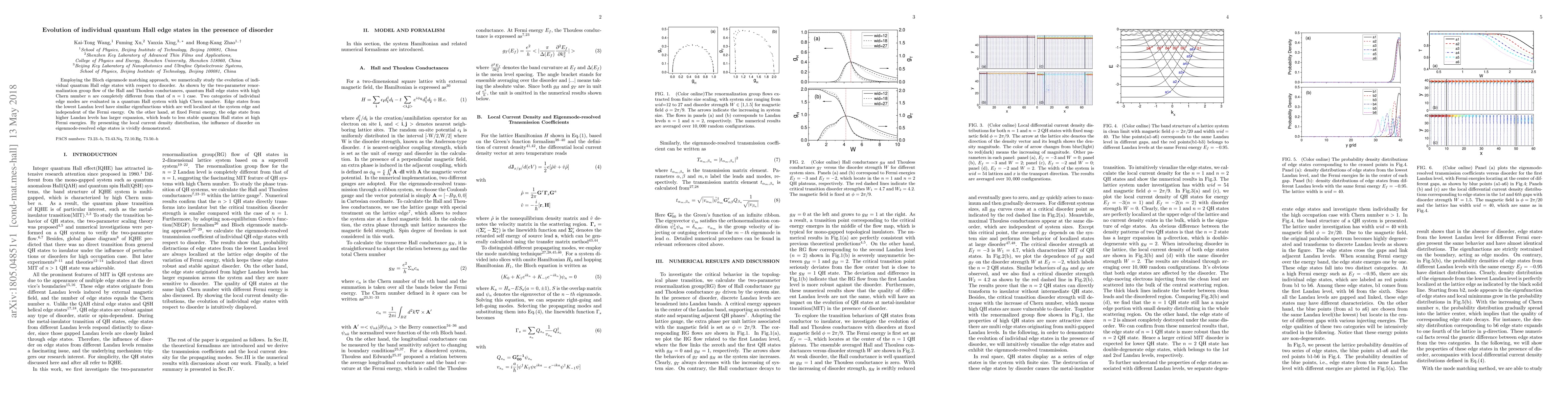Employing the Bloch eigenmode matching approach, we numerically study the evolution of individual quantum Hall edge states with respect to disorder. As shown by the two-parameter renormalization group flow of the Hall and Thouless conductances, quantum Hall edge states with high Chern number n are completely different from that of n=1 case. Two categories of individual edge modes are evaluated in a quantum Hall system with high Chern number. Edge states from the lowest Landau level have similar eigenfunctions which are well localized at the system edge and independent of the Fermi energy. On the other hand, at fixed Fermi energy, the edge state from higher Landau levels has larger expansion, which leads to less stable quantum Hall states at high Fermi energies. By presenting the local current density distribution, the influence of disorder on eigenmode-resolved edge states is vividly demonstrated.