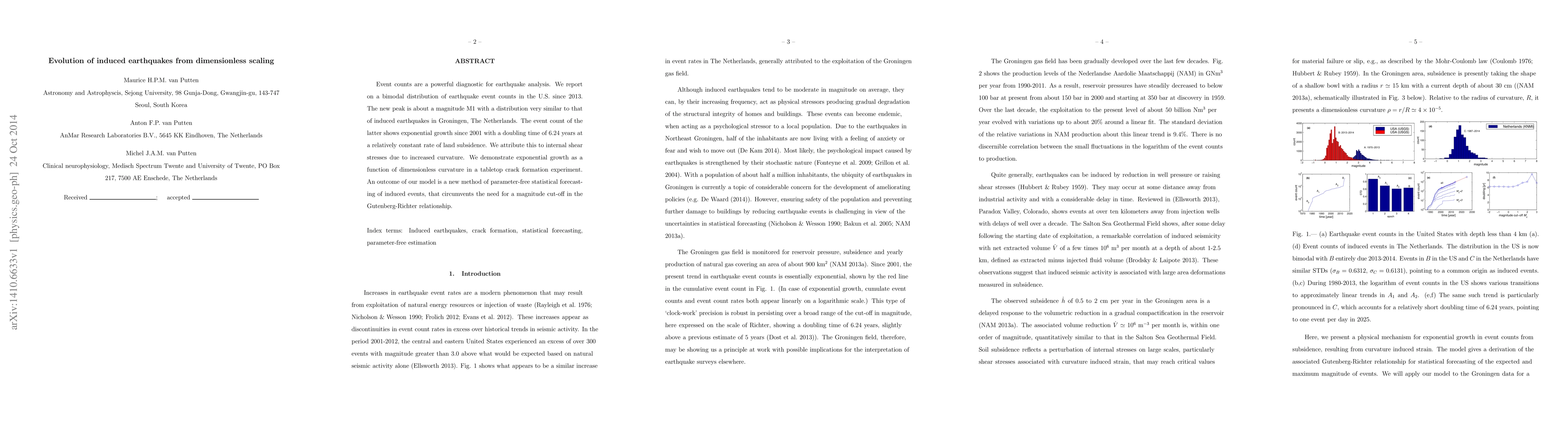 Event counts are a powerful diagnostic for earthquake analysis. We report on a bimodal distribution of earthquake event counts in the U.S. since 2013. The new peak is about a magnitude M1 with a distribution very similar to that of induced earthquakes in Groningen, The Netherlands, characterized by exponential growth in event count since 2001. The latter shows a doubling time of 6.24 years with a relatively constant rate of land subsidence. We model its internal shear stresses as a function of dimensionless curvature and illustrate the resulting exponential growth in a tabletop crack formation experiment. Our study proposes a new method of parameter-free statistical forecasting of induced events, that circumvents the need for a magnitude cut-off in the Gutenberg-Richter relationship.