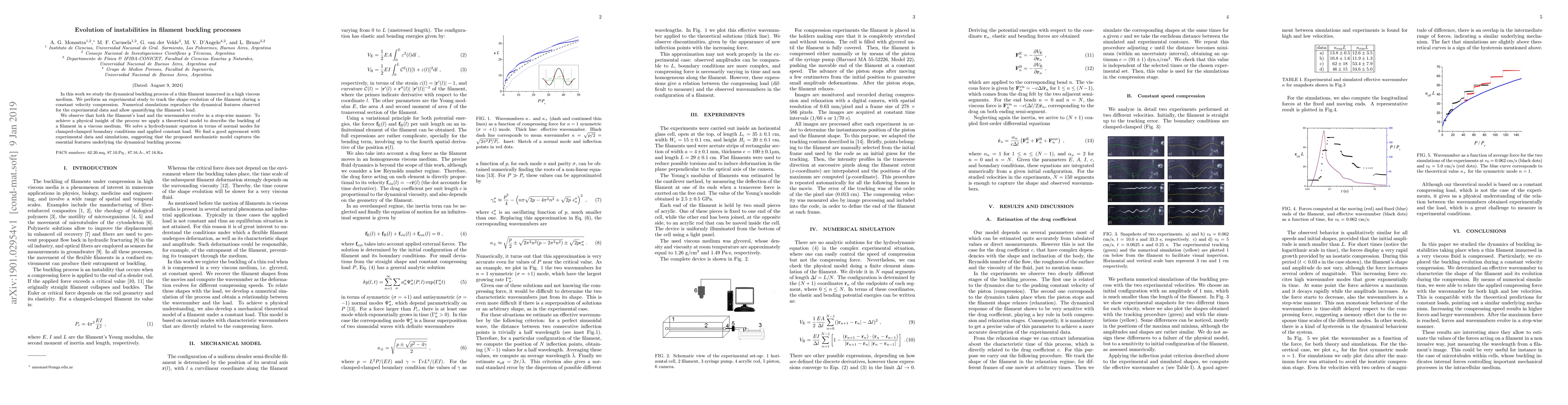This paper investigates the dynamical buckling of a thin filament in a high viscous medium through experiments and numerical simulations. The study reveals step-wise evolution of the filament's load and wavenumber, supported by a theoretical model that accurately describes the buckling process, showing strong agreement with experimental and simulated data.