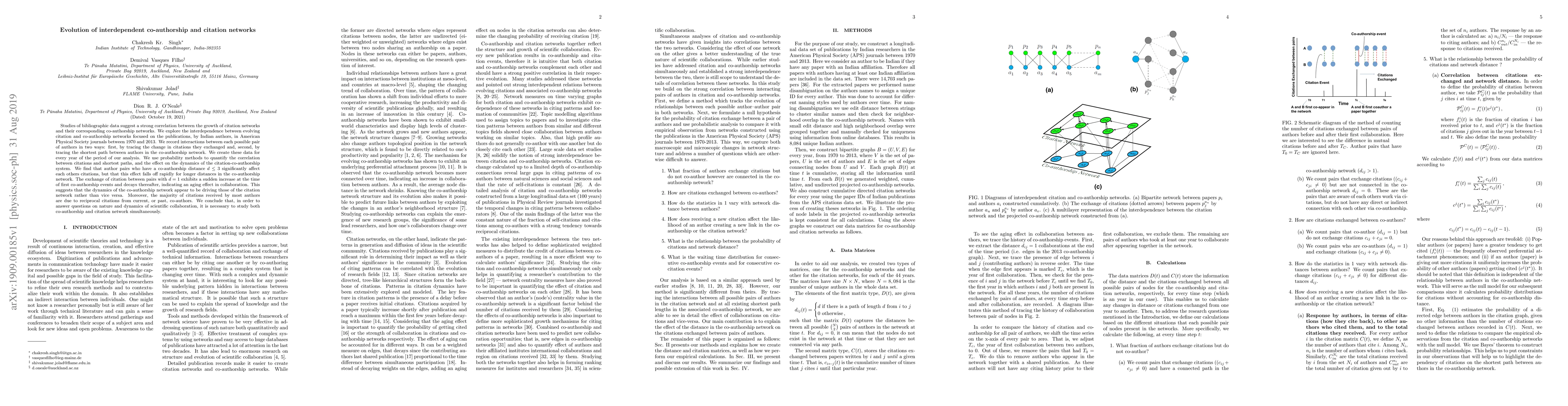 Studies of bibliographic data suggest a strong correlation between the growth of citation networks and their corresponding co-authorship networks. We explore the interdependence between evolving citation and co-authorship networks focused on the publications, by Indian authors, in American Physical Society journals between 1970 and 2013. We record interactions between each possible pair of authors in two ways: first, by tracing the change in citations they exchanged and, second, by tracing the shortest path between authors in the co-authorship network. We create these data for every year of the period of our analysis. We use probability methods to quantify the correlation between citations and shortest paths, and the effect on the dynamics of the citation-co-authorship system. We find that author pairs who have a co-authorship distance $d \leq 3$ significantly affect each others citations, but that this effect falls off rapidly for longer distances in the co-authorship network. The exchange of citation between pairs with $d=1$ exhibits a sudden increase at the time of first co-authorship events and decays thereafter, indicating an aging effect in collaboration. This suggests that the dynamics of the co-authorship network appear to be driving those of the citation network rather than vice versa. Moreover, the majority of citations received by most authors are due to reciprocal citations from current, or past, co-authors. We conclude that, in order to answer questions on nature and dynamics of scientific collaboration, it is necessary to study both co-authorship and citation network simultaneously.