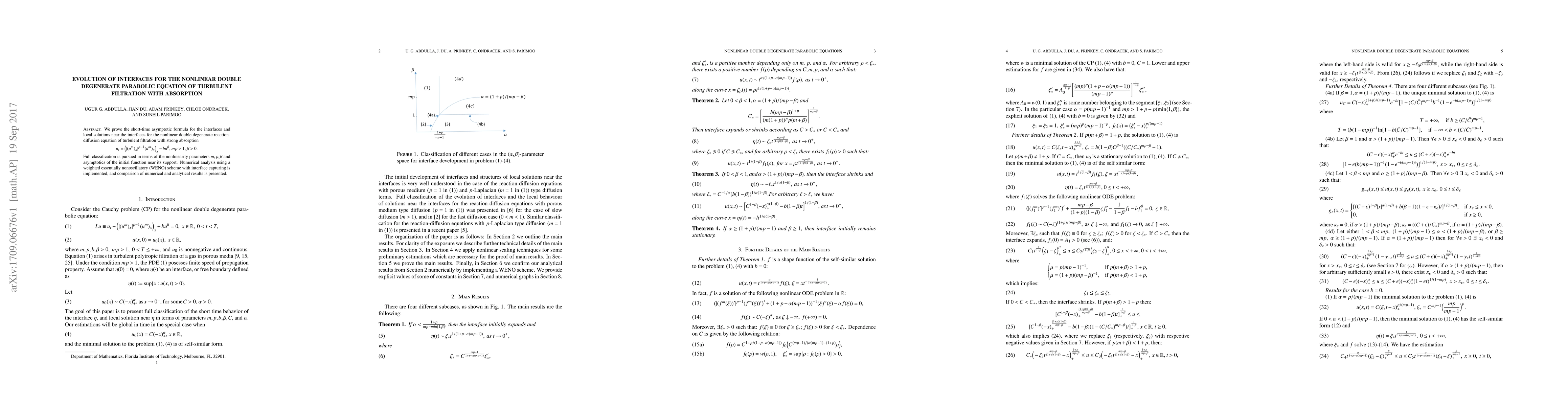 We prove the short-time asymptotic formula for the interfaces and local solutions near the interfaces for the nonlinear double degenerate reaction-diffusion equation of turbulent filtration with strong absorption \[ u_t=\Big(|(u^{m})_x|^{p-1}(u^{m})_x\Big)_x-bu^{\beta}, \, mp>1, \, \beta >0. \] Full classification is pursued in terms of the nonlinearity parameters $m, p,\beta$ and asymptotics of the initial function near its support. Numerical analysis using a weighted essentially nonoscillatory (WENO) scheme with interface capturing is implemented, and comparison of numerical and analytical results is presented.