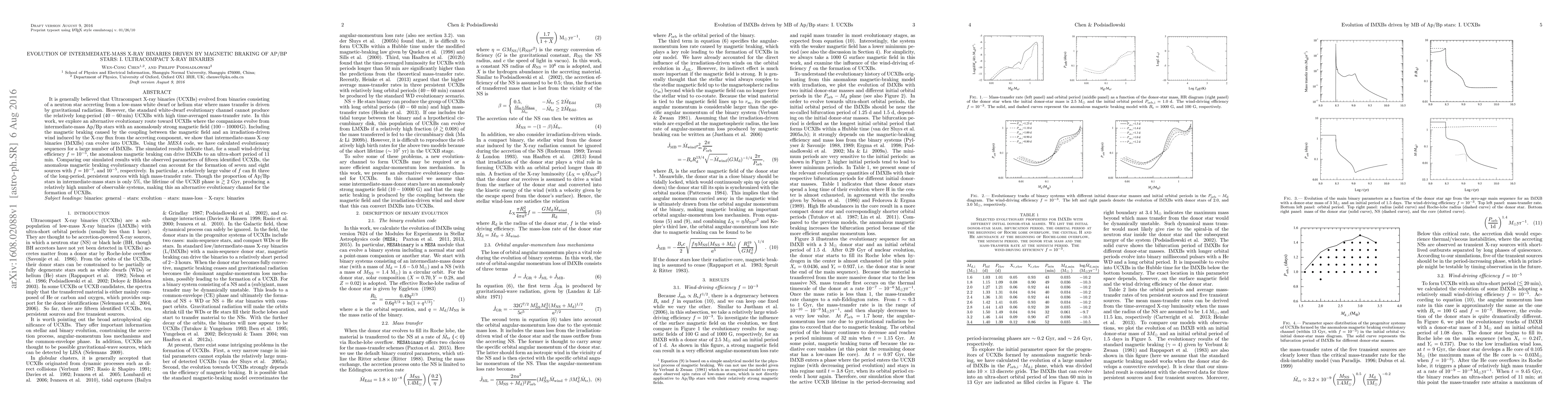 This paper proposes an alternative evolutionary pathway for Ultracompact X-ray Binaries (UCXBs), where neutron stars accrete from intermediate-mass Ap/Bp stars instead of low-mass white dwarfs. The study uses magnetic braking driven by strong magnetic fields to explain the formation of UCXBs, showing that this mechanism can produce the observed long-period UCXBs.