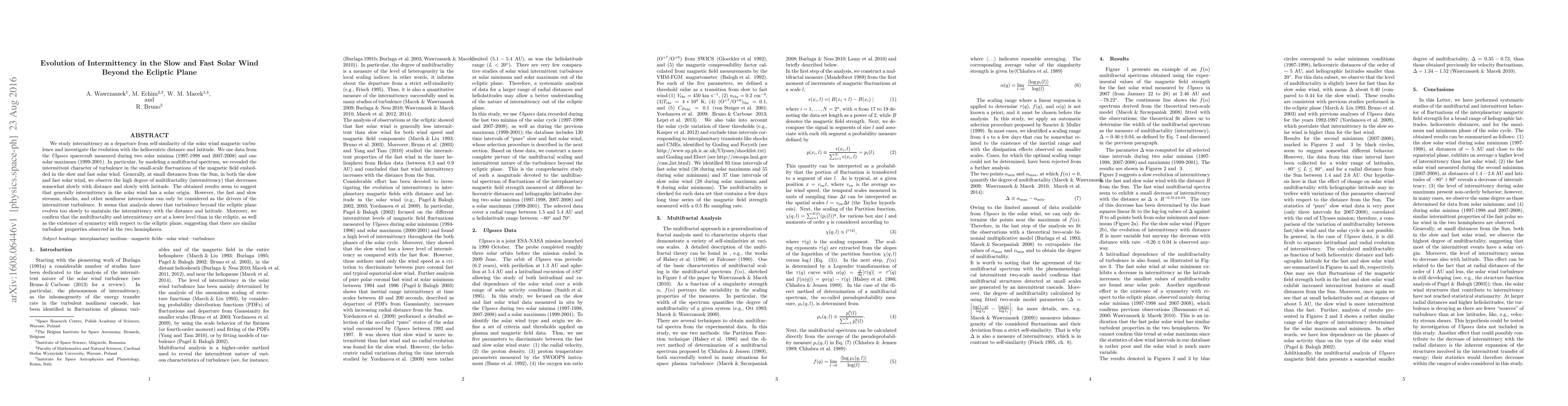 This study investigates the evolution of intermittency in solar wind magnetic turbulence using Ulysses spacecraft data from different solar activity periods. It finds that intermittency, characterized by a high degree of multifractality, decreases slowly with heliocentric distance and latitude, suggesting a solar origin, while turbulence beyond the ecliptic plane exhibits slower evolution and lower intermittency levels with symmetry between hemispheres.