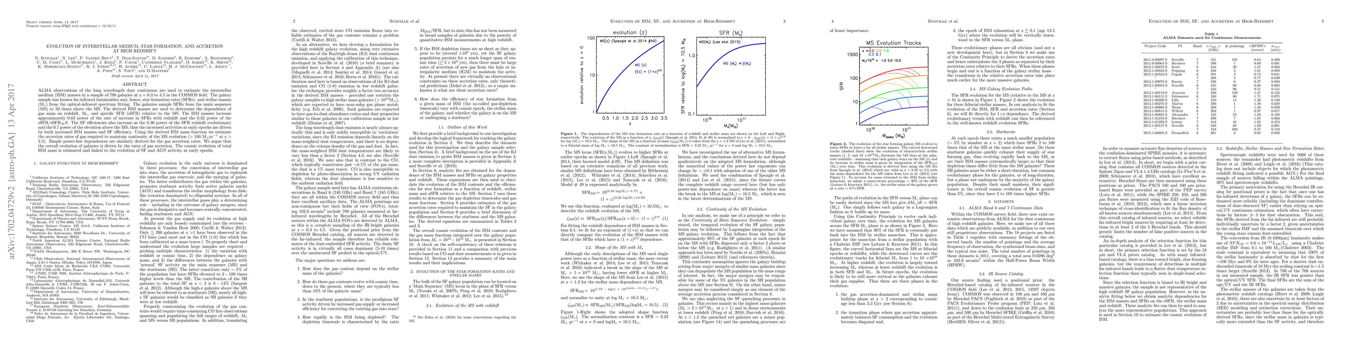 ALMA observations of the long wavelength dust continuum are used to estimate the interstellar medium (ISM) masses in a sample of 708 galaxies at z = 0.3 to 4.5 in the COSMOS field. The galaxy sample has known far-infrared luminosities and, hence, star formation rates (SFRs), and stellar masses (M$_{\rm *}$) from the optical-infrared spectrum fitting. The galaxies sample SFRs from the main sequence (MS) to 50 times above the MS. The derived ISM masses are used to determine the dependence of gas mass on redshift, M$_{\rm *}$, and specific SFR (sSFR) relative to the MS. The ISM masses increase approximately 0.63 power of the rate of increase in SFRs with redshift and the 0.32 power of the sSFR/sSFR$_MS$. The SF efficiencies also increase as the 0.36 power of the SFR redshift evolutionary and the 0.7 power of the elevation above the MS; thus the increased activities at early epochs are driven by both increased ISM masses and SF efficiency. Using the derived ISM mass function we estimate the accretion rates of gas required to maintain continuity of the MS evolution ($>100$ \msun yr$^{-1}$ at z $>$ 2.5). Simple power-law dependences are similarly derived for the gas accretion rates. We argue that the overall evolution of galaxies is driven by the rates of gas accretion. The cosmic evolution of total ISM mass is estimated and linked to the evolution of SF and AGN activity at early epochs.