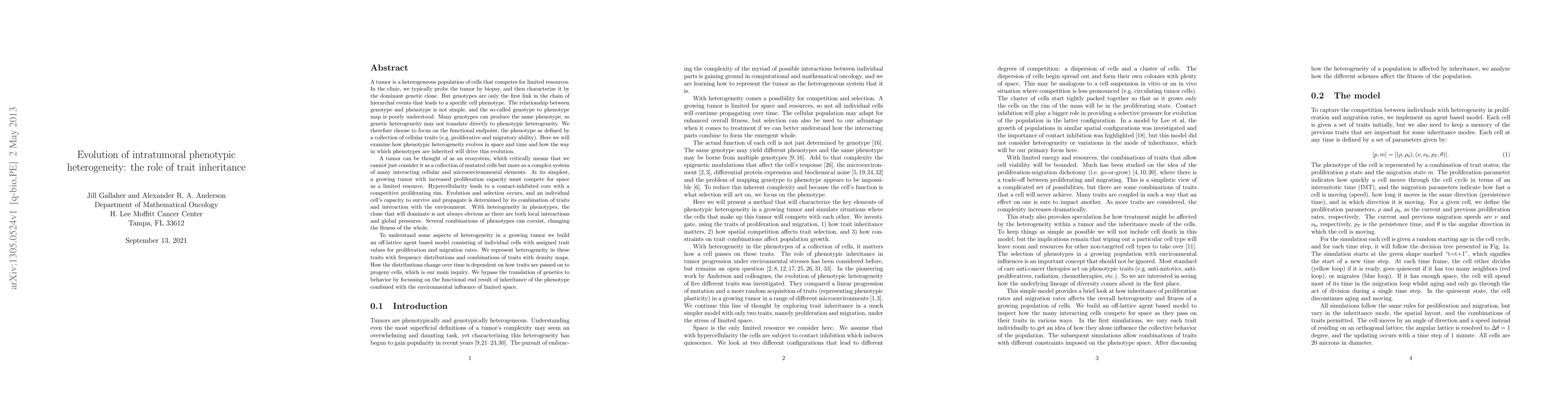 A tumor can be thought of as an ecosystem, which critically means that we cannot just consider it as a collection of mutated cells but more as a complex system of many interacting cellular and microenvironmental elements. At its simplest, a growing tumor with increased proliferation capacity must compete for space as a limited resource. Hypercellularity leads to a contact-inhibited core with a competitive proliferating rim. Evolution and selection occurs, and an individual cell's capacity to survive and propagate is determined by its combination of traits and interaction with the environment. With heterogeneity in phenotypes, the clone that will dominate is not always obvious as there are both local interactions and global pressures. Several combinations of phenotypes can coexist, changing the fitness of the whole. To understand some aspects of heterogeneity in a growing tumor we build an off-lattice agent based model consisting of individual cells with assigned trait values for proliferation and migration rates. We represent heterogeneity in these traits with frequency distributions and combinations of traits with density maps. How the distributions change over time is dependent on how traits are passed on to progeny cells, which is our main inquiry. We bypass the translation of genetics to behavior by focussing on the functional end result of inheritance of the phenotype combined with the environmental influence of limited space.