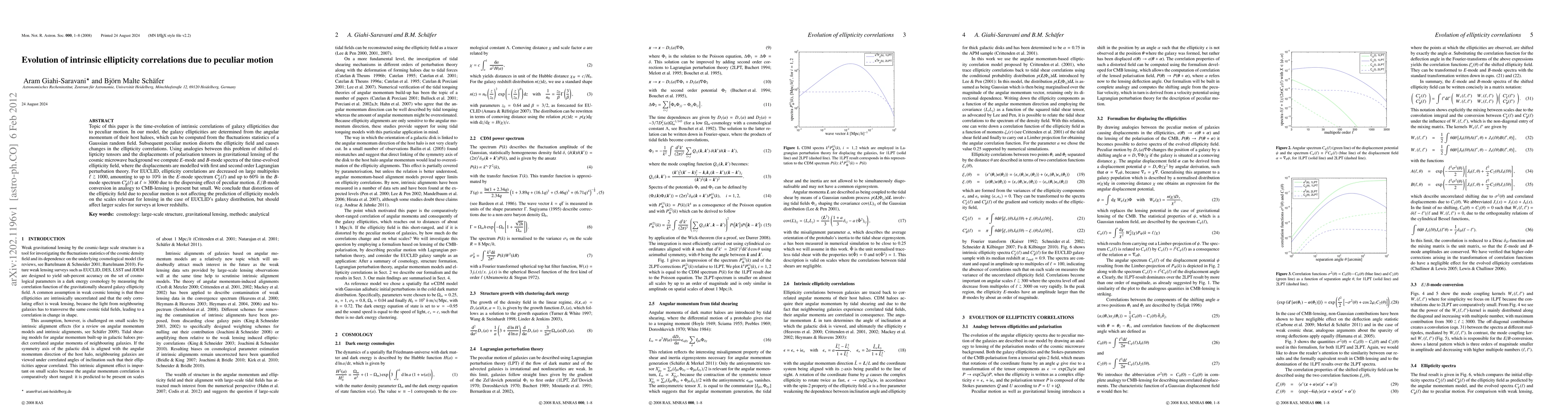 Topic of this paper is the time-evolution of intrinsic correlations of galaxy ellipticities due to peculiar motion. In our model, the galaxy ellipticities are determined from the angular momentum of their host haloes, which can be computed from the fluctuations statistics of a Gaussian random field. Subsequent peculiar motion distorts the ellipticity field and causes changes in the ellipticity correlations. Using analogies between this problem of shifted ellipticity tensors and the displacements of polarisation tensors in gravitational lensing of the cosmic microwave background we compute E-mode and B-mode spectra of the time-evolved ellipticity field, where the displacements are modelled with first and second order Lagrangian perturbation theory. For EUCLID, ellipticity correlations are decreased on large multipoles l >1000, amounting to up to 10% in the E-mode spectrum C_E^epsilon(l) and up to 60% in the B-mode spectrum C_B^epsilon(l) at l~3000 due to the dispersing effect of peculiar motion. E/B-mode conversion in analogy to CMB-lensing is present but small. We conclude that distortions of the ellipticity field due to peculiar motion is not affecting the prediction of ellipticity models on the scales relevant for lensing in the case of EUCLID's galaxy distribution, but should affect larger scales for surveys at lower redshifts.