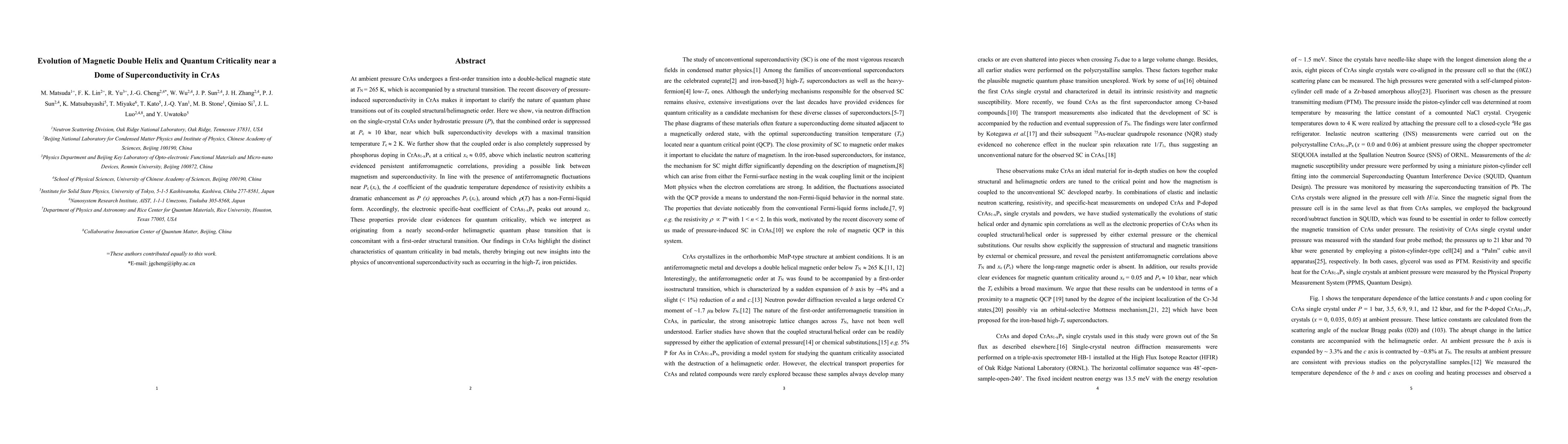 This study investigates the evolution of magnetic double helix and quantum criticality in CrAs under pressure and doping, revealing suppression of coupled structural/helimagnetic order near the onset of superconductivity. The findings suggest a quantum critical point linked to a nearly second-order helimagnetic transition, providing insights into the physics of unconventional superconductivity.