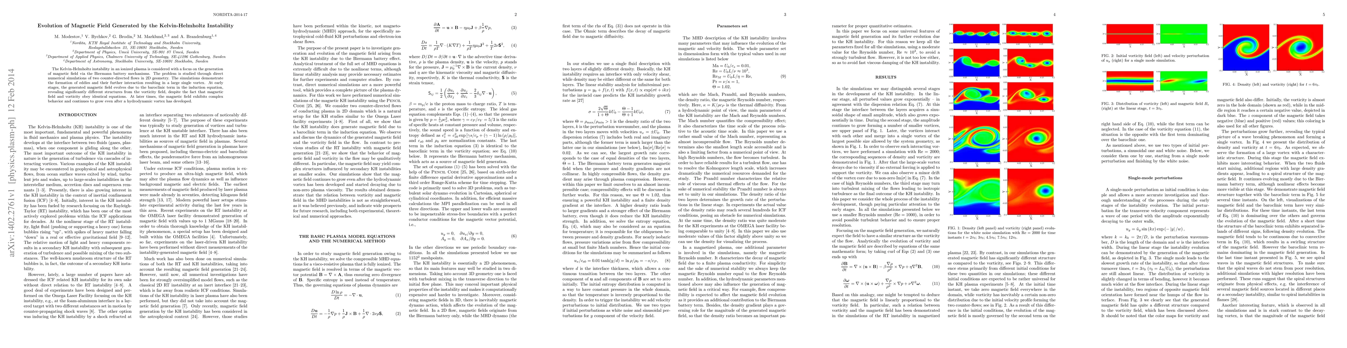 This paper investigates the Kelvin-Helmholtz instability in ionized plasma, focusing on magnetic field generation via Biermann battery mechanisms. Numerical simulations reveal the formation of eddies leading to a large vortex, with early magnetic field evolution driven by the baroclinic term, and later complex growth independent of the hydrodynamic vortex.