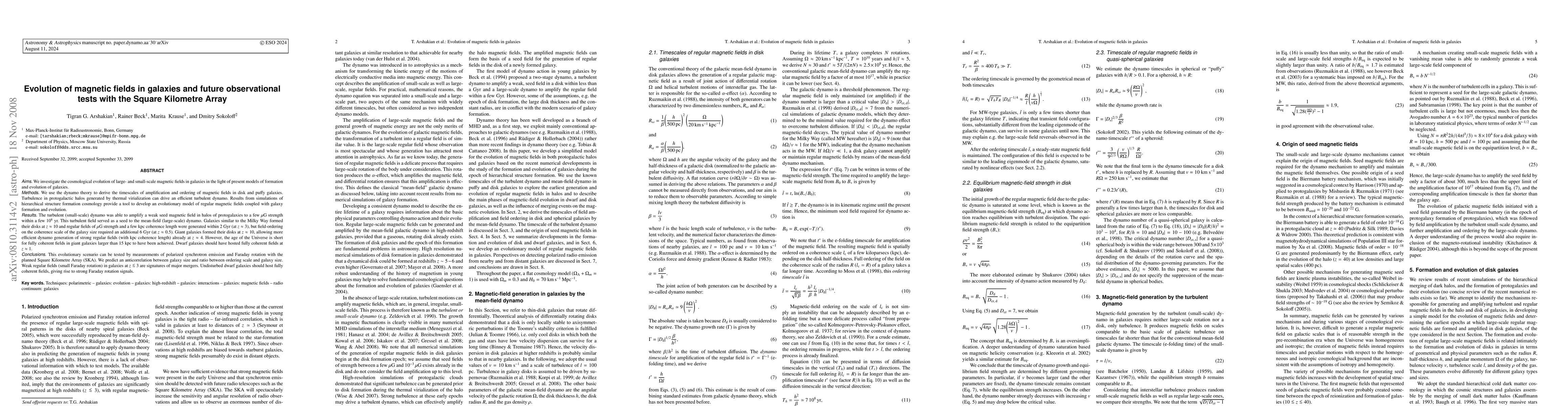 This paper explores the evolution of magnetic fields in galaxies using dynamo theory and simulations, showing that small-scale turbulent fields amplify to form large-scale regular fields. Predictions for the Square Kilometre Array (SKA) include testing this evolutionary model through polarized synchrotron emission and Faraday rotation measurements.