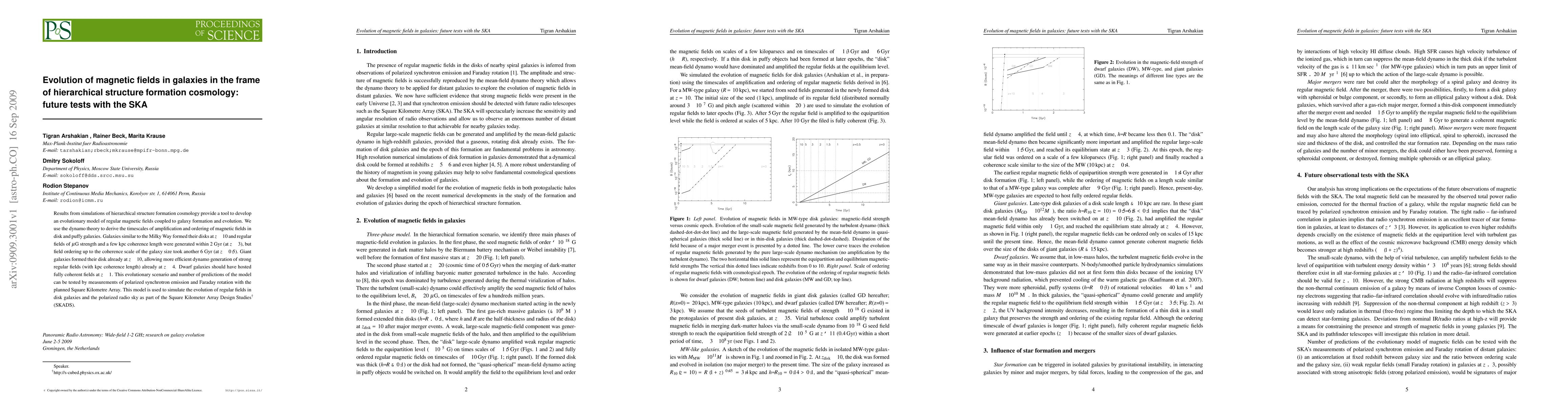Results from simulations of hierarchical structure formation cosmology provide a tool to develop an evolutionary model of regular magnetic fields coupled to galaxy formation and evolution. We use the dynamo theory to derive the timescales of amplification and ordering of magnetic fields in disk and puffy galaxies. Galaxies similar to the Milky Way formed their disks at $z\approx10$ and regular fields of $\mu$G strength and a few kpc coherence length were generated within 2 Gyr (at $z\approx3$), but field ordering up to the coherence scale of the galaxy size took another 6 Gyr (at $z\approx0.5$). Giant galaxies formed their disk already at $z\approx10$, allowing more efficient dynamo generation of strong regular fields (with kpc coherence length) already at $z\approx4$. Dwarf galaxies should have hosted fully coherent fields at $z\approx1$. This evolutionary scenario and number of predictions of the model can be tested by measurements of polarized synchrotron emission and Faraday rotation with the planned Square Kilometre Array. This model is used to simulate the evolution of regular fields in disk galaxies and the polarized radio sky as part of the Square Kilometer Array Design Studies (SKADS).