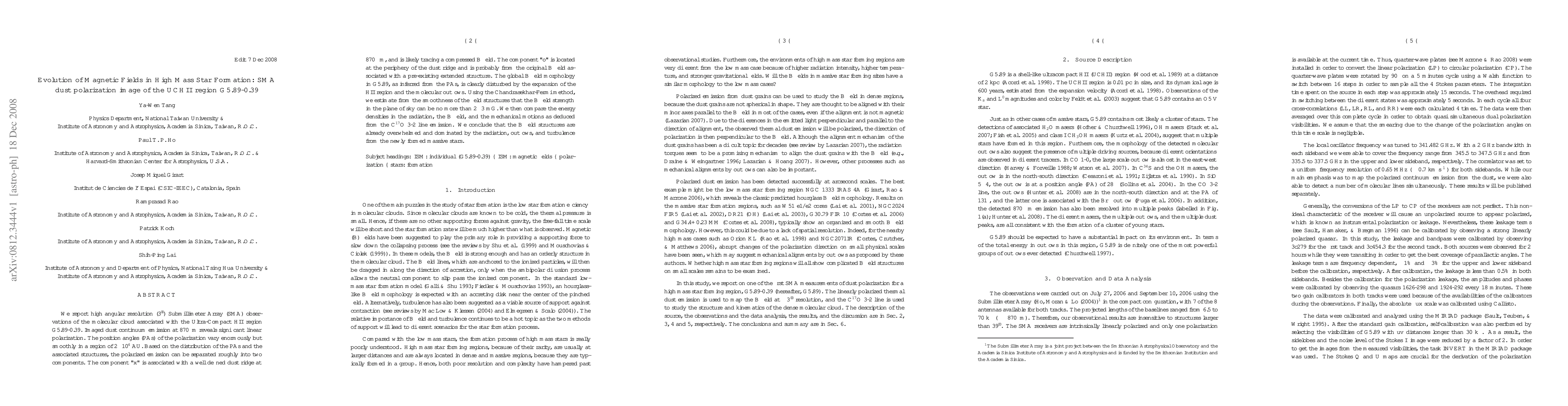 We report high angular resolution (3") Submillimeter Array (SMA) observations of the molecular cloud associated with the Ultra-Compact HII region G5.89-0.39. Imaged dust continuum emission at 870 micron reveals significant linear polarization. The position angles (PAs) of the polarization vary enormously but smoothly in a region of 2x10^4 AU. Based on the distribution of the PAs and the associated structures, the polarized emission can be separated roughly into two components. The component "x" is associated with a well defined dust ridge at 870 micron, and is likely tracing a compressed B field. The component "o" is located at the periphery of the dust ridge and is probably from the original B field associated with a pre-existing extended structure. The global B field morphology in G5.89, as inferred from the PAs, is clearly disturbed by the expansion of the HII region and the molecular outflows. Using the Chandrasekhar-Fermi method, we estimate from the smoothness of the field structures that the B field strength in the plane of sky can be no more than 2-3 mG. We then compare the energy densities in the radiation, the B field, and the mechanical motions as deduced from the C^17O 3-2 line emission. We conclude that the B field structures are already overwhelmed and dominated by the radiation, outflows, and turbulence from the newly formed massive stars.