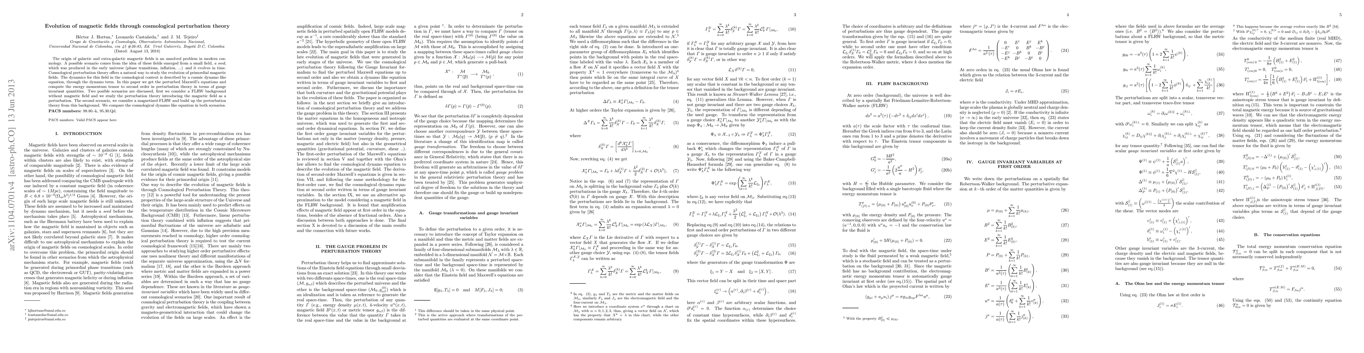 The origin of galactic and extra-galactic magnetic fields is an unsolved problem in modern cosmology. A possible scenario comes from the idea of these fields emerged from a small field, a seed, which was produced in the early universe (phase transitions, inflation, ...) and it evolves in time. Cosmological perturbation theory offers a natural way to study the evolution of primordial magnetic fields. The dynamics for this field in the cosmological context is described by a cosmic dynamo like equation, through the dynamo term. In this paper we get the perturbed Maxwell's equations and compute the energy momentum tensor to second order in perturbation theory in terms of gauge invariant quantities. Two possible scenarios are discussed, first we consider a FLRW background without magnetic field and we study the perturbation theory introducing the magnetic field as a perturbation. The second scenario, we consider a magnetized FLRW and build up the perturbation theory from this background. We compare the cosmological dynamo like equation in both scenarios.