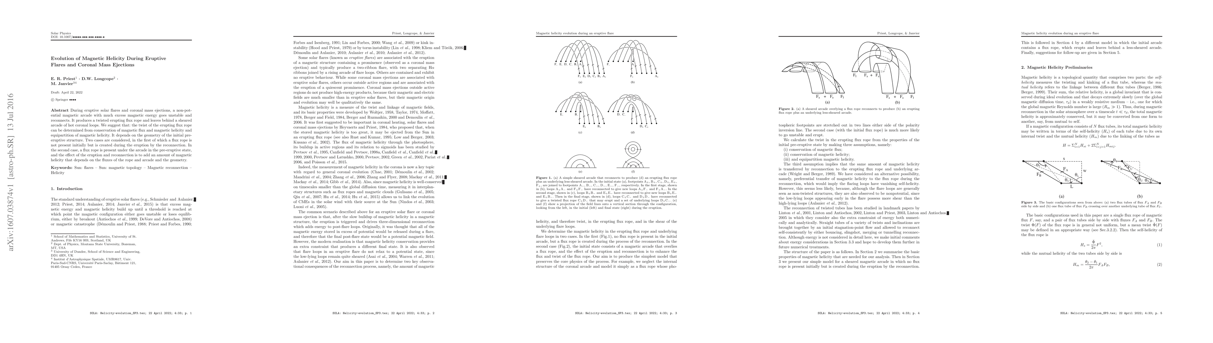 This paper investigates the evolution of magnetic helicity during solar flares and coronal mass ejections, focusing on the twist of erupting flux ropes and the geometry of the initial magnetic structure. It proposes that the twist can be determined through conservation laws and equipartition, with the amount of magnetic helicity added during reconnection depending on the pre-existing flux rope and arcade geometries.