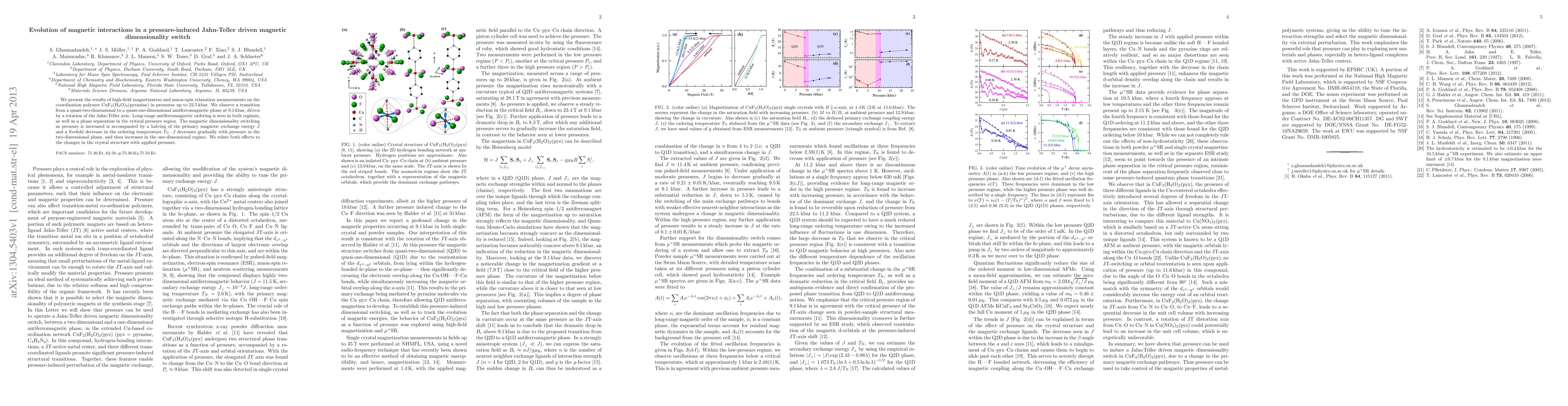 We present the results of high-field magnetization and muon-spin relaxation measurements on the coordination polymer CuF_2(H_2O)_2(pyrazine) in pressures up to 22.5 kbar. We observe a transition from a quasi-two-dimensional to a quasi-one-dimensional antiferromagnetic phase at 9.1 kbar, driven by a rotation of the Jahn-Teller axis. Long-range antiferromagnetic ordering is seen in both regimes, as well as a phase separation in the critical pressure region. The magnetic dimensionality switching as pressure is increased is accompanied by a halving of the primary magnetic exchange energy J and a fivefold decrease in the ordering temperature T_N. J decreases gradually with pressure in the two-dimensional phase, and then increases in the one-dimensional regime. We relate both effects to the changes in the crystal structure with applied pressure.