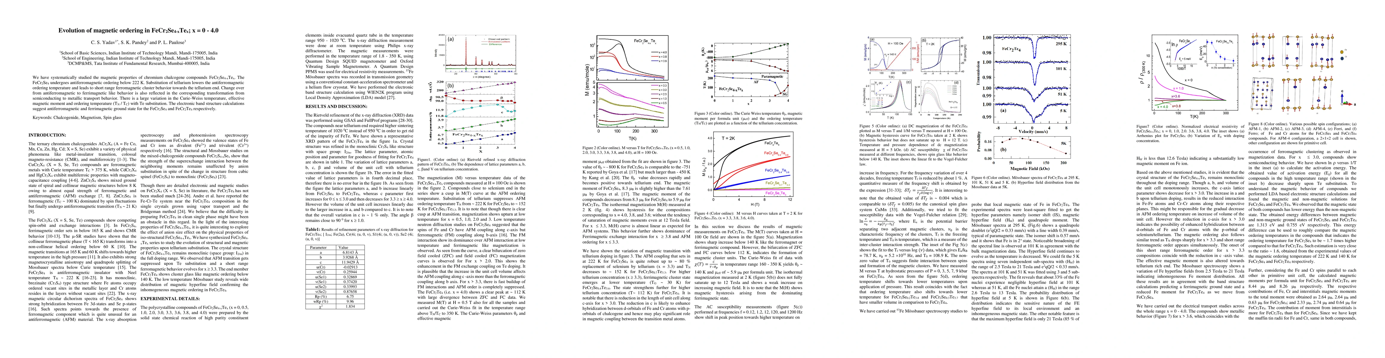 We have systematically studied the magnetic properties of chromium chalcogene compounds FeCr$_2$Se$_{4-x}$Te$_x$. The FeCr2Se4 undergoes antiferromagnetic ordering below 222 K. Substitution of tellurium lowers the antiferromagnetic ordering temperature and leads to short range ferromagnetic cluster behavior towards the tellurium end. Change over from antiferromagnetic to ferrimagnetic like behavior is also reflected in the corresponding transformation from semiconducting to metallic transport behavior. There is a large variation in the Curie-Weiss temperature, effective magnetic moment and ordering temperature (TN / TC) with Te substitution. The electronic band structure calculations suggest antiferromagnetic and ferrimagnetic ground state for the FeCr2Se4 and FeCr2Te4 respectively.