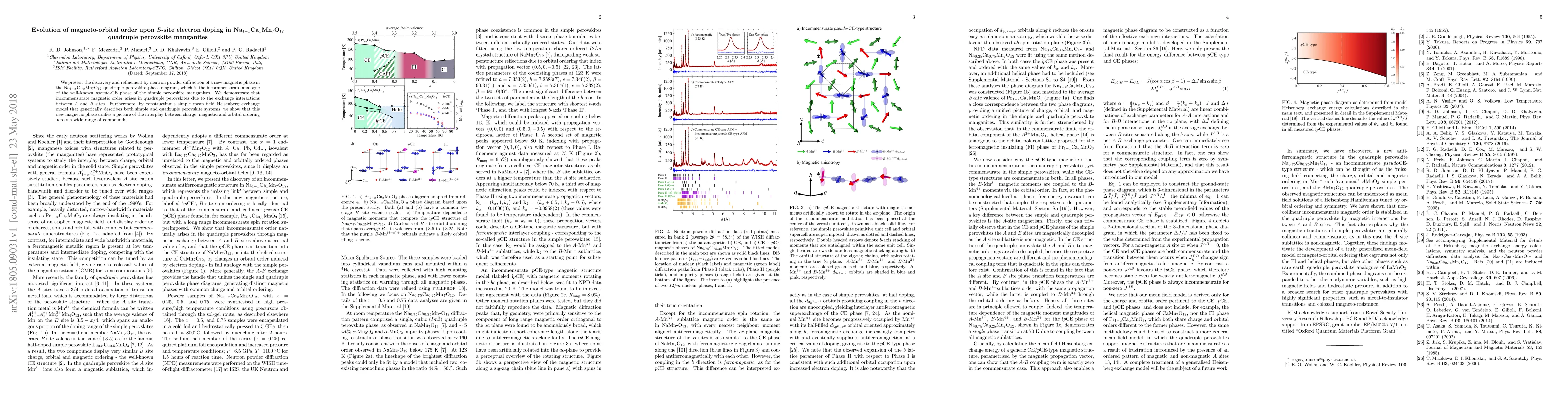 This research identifies a new magnetic phase in Na1-xCaxMn7O12 quadruple perovskite manganites via neutron powder diffraction, revealing incommensurate magneto-orbital order due to A-B site exchange interactions. The study unifies the understanding of charge, magnetic, and orbital ordering in both simple and quadruple perovskite systems through a mean field Heisenberg model.
