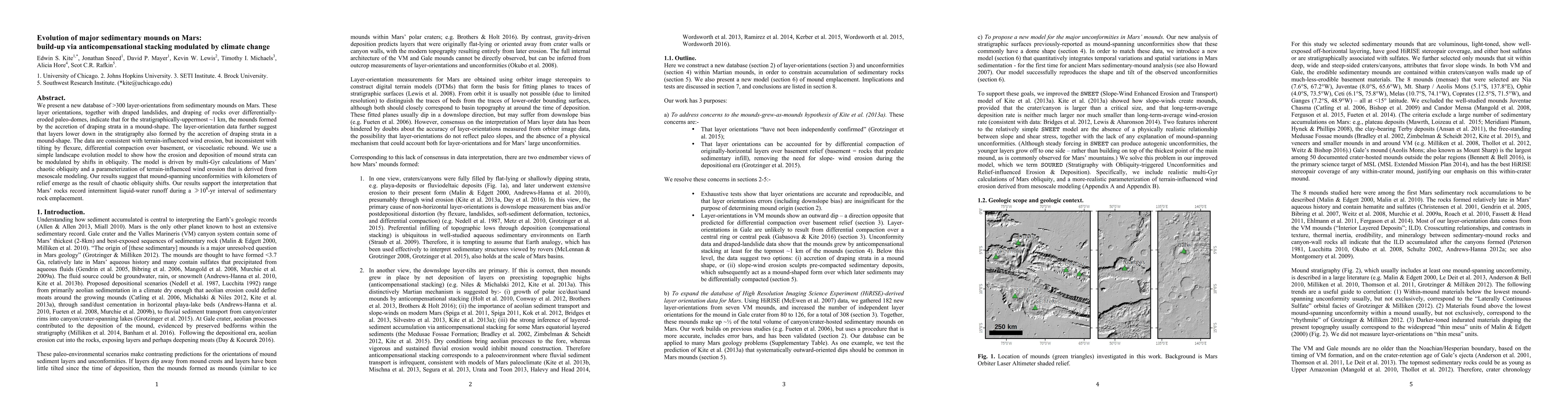 This paper presents a database of sedimentary mound layer orientations on Mars, indicating that mound formation is primarily due to wind-driven erosion and deposition modulated by Mars' obliquity shifts. The study supports the idea that Mars' sedimentary rocks record intermittent liquid-water activity over a long geological period.