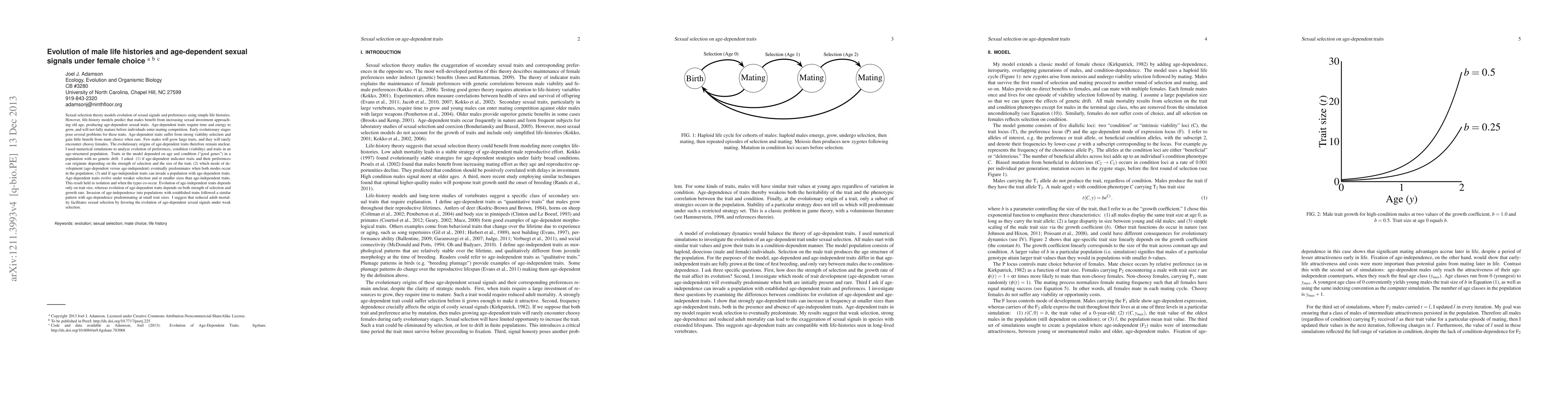 This paper explores the evolution of age-dependent sexual traits in males under female choice, finding that such traits evolve under weaker selection and smaller sizes compared to age-independent traits. It concludes that reduced adult mortality can favor the evolution of these traits under weak selection.