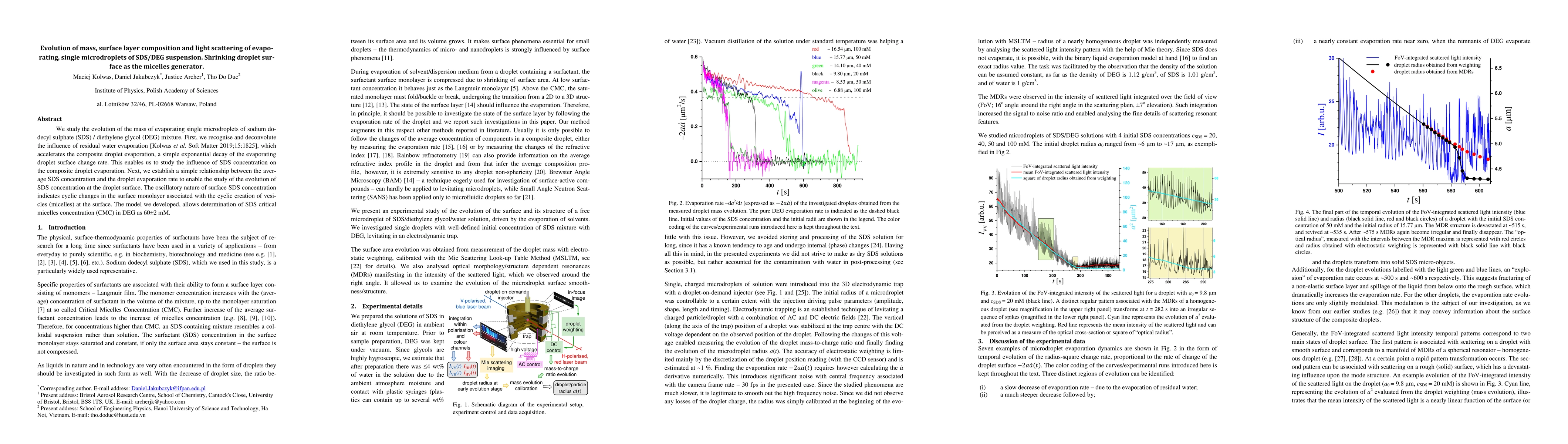 This study investigates the mass and surface layer composition changes in evaporating SDS/DEG microdroplets, revealing an exponential decay in surface change rate and oscillatory SDS concentration linked to micelle formation. The developed model determines SDS critical micelle concentration (CMC) in DEG to be 60±2 mM.
