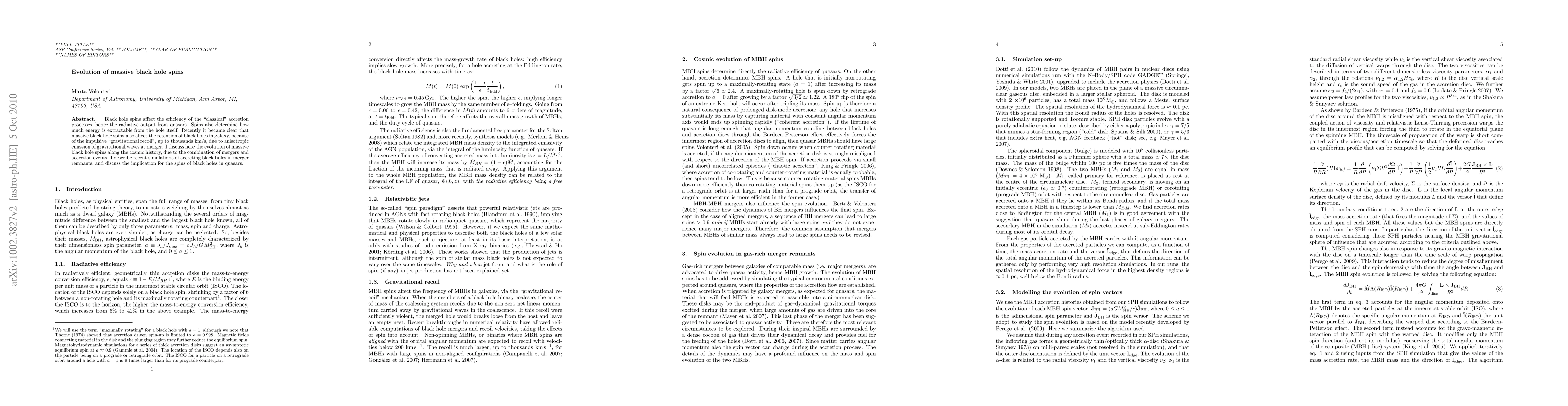 This paper explores the evolution of massive black hole spins throughout cosmic history, emphasizing their impact on accretion processes, radiative output from quasars, and gravitational recoil effects from mergers. It discusses recent simulations of black hole spins in merger remnants and their implications for the spins of black holes in quasars.