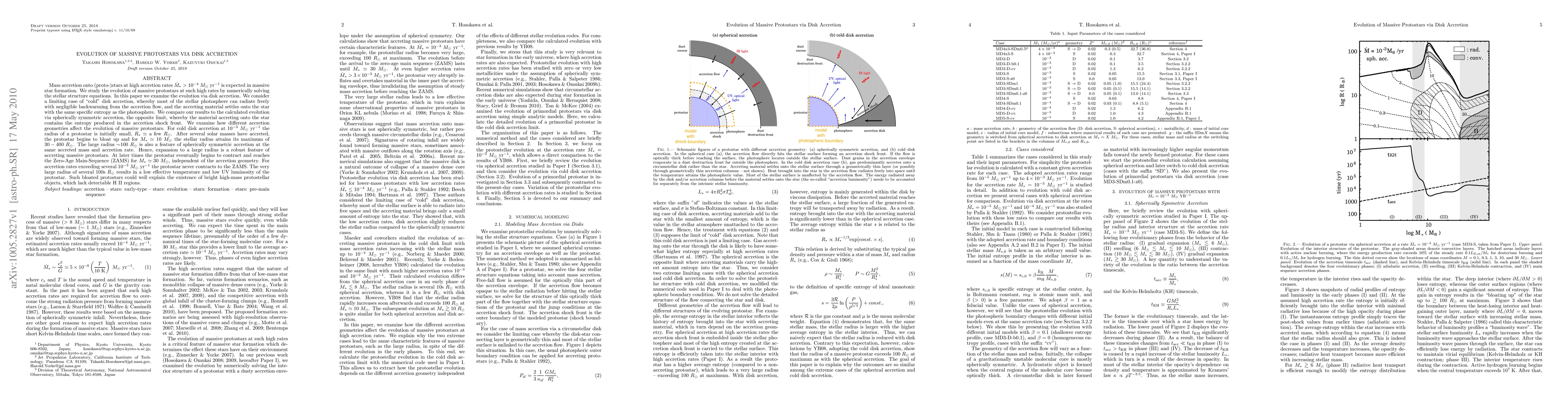 Mass accretion onto (proto-)stars at high accretion rates > 10^-4 M_sun/yr is expected in massive star formation. We study the evolution of massive protostars at such high rates by numerically solving the stellar structure equations. In this paper we examine the evolution via disk accretion. We consider a limiting case of "cold" disk accretion, whereby most of the stellar photosphere can radiate freely with negligible backwarming from the accretion flow, and the accreting material settles onto the star with the same specific entropy as the photosphere. We compare our results to the calculated evolution via spherically symmetric accretion, the opposite limit, whereby the material accreting onto the star contains the entropy produced in the accretion shock front. We examine how different accretion geometries affect the evolution of massive protostars. For cold disk accretion at 10^-3 M_sun/yr the radius of a protostar is initially small, about a few R_sun. After several solar masses have accreted, the protostar begins to bloat up and for M \simeq 10 M_sun the stellar radius attains its maximum of 30 - 400 R_sun. The large radius about 100 R_sun is also a feature of spherically symmetric accretion at the same accreted mass and accretion rate. Hence, expansion to a large radius is a robust feature of accreting massive protostars. At later times the protostar eventually begins to contract and reaches the Zero-Age Main-Sequence (ZAMS) for M \simeq 30 M_sun, independent of the accretion geometry. For accretion rates exceeding several 10^-3 M_sun/yr the protostar never contracts to the ZAMS. The very large radius of several 100s R_sun results in a low effective temperature and low UV luminosity of the protostar. Such bloated protostars could well explain the existence of bright high-mass protostellar objects, which lack detectable HII regions.