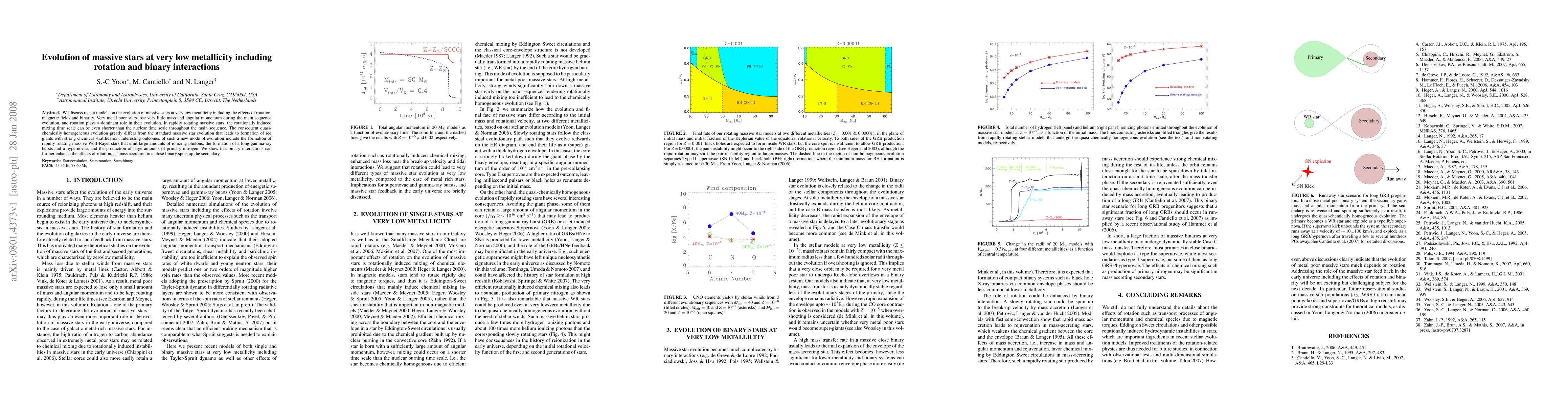 This paper explores the evolution of massive stars at very low metallicity, emphasizing the roles of rotation, magnetic fields, and binary interactions. It finds that low metallicity leads to minimal mass and angular momentum loss, with rotation significantly altering the standard evolution path, resulting in unique outcomes like rapidly rotating Wolf-Rayet stars and enhanced gamma-ray bursts.