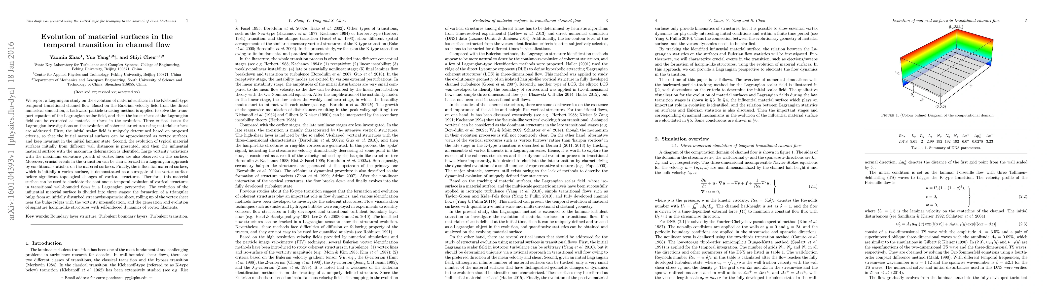This research uses a Lagrangian approach to study material surface evolution in K-type temporal transitional channel flow, identifying an influential material surface as a vortex surface surrogate. The study reveals three stages of its evolution: formation of a triangular bulge, rolling up of vortex sheets, and generation of hairpin-like structures, offering insights into vortical structure evolution in transitional wall-bounded flows.