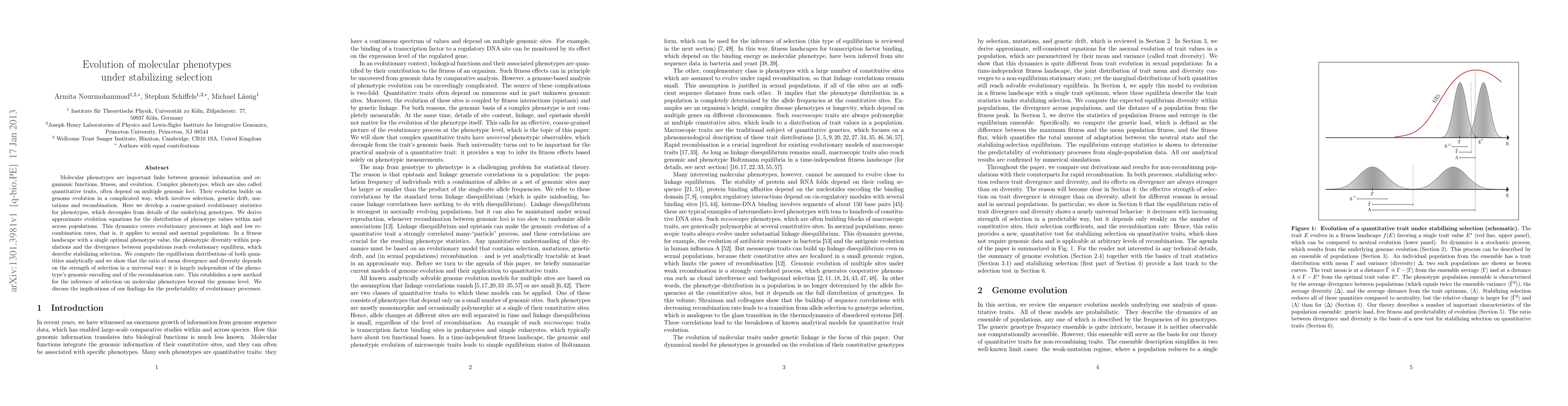 This paper develops a statistical framework to analyze the evolution of molecular phenotypes under stabilizing selection, deriving equations for phenotype distribution dynamics. It finds that the ratio of mean divergence and diversity within populations is largely independent of genomic encoding and recombination rate, establishing a new method for inferring selection beyond the genome level.