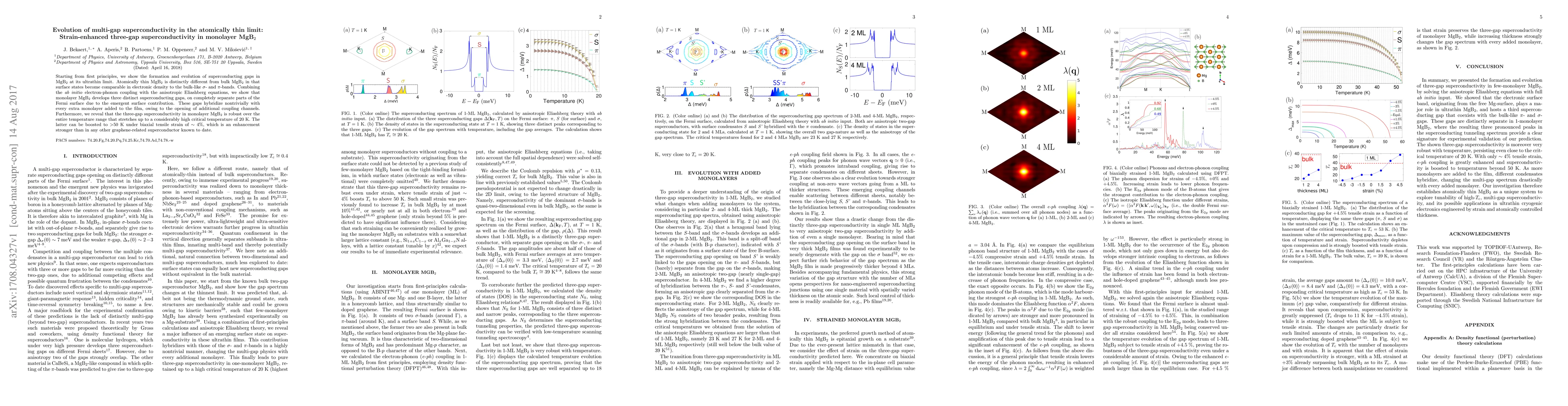 Starting from first principles, we show the formation and evolution of superconducting gaps in MgB$_2$ at its ultrathin limit. Atomically thin MgB$_2$ is distinctly different from bulk MgB$_2$ in that surface states become comparable in electronic density to the bulk-like $\sigma$- and $\pi$-bands. Combining the ab initio electron-phonon coupling with the anisotropic Eliashberg equations, we show that monolayer MgB$_2$ develops three distinct superconducting gaps, on completely separate parts of the Fermi surface due to the emergent surface contribution. These gaps hybridize nontrivially with every extra monolayer added to the film, owing to the opening of additional coupling channels. Furthermore, we reveal that the three-gap superconductivity in monolayer MgB$_2$ is robust over the entire temperature range that stretches up to a considerably high critical temperature of 20 K. The latter can be boosted to $>$50 K under biaxial tensile strain of $\sim$ 4\%, which is an enhancement stronger than in any other graphene-related superconductor known to date.