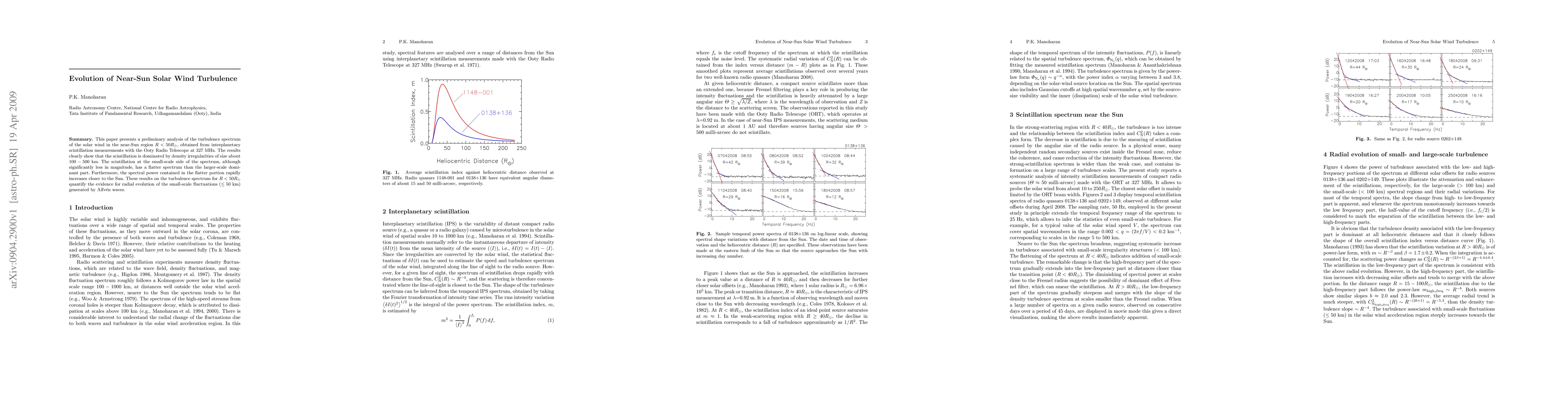 This study, using Ooty Radio Telescope data, reveals that solar wind turbulence near Sun (R < 50 Rs) is dominated by 100-500 km density irregularities. The analysis shows a flatter spectrum for smaller scale fluctuations (< 50 km), increasing in power closer to the Sun, suggesting radial evolution driven by Alfven waves.