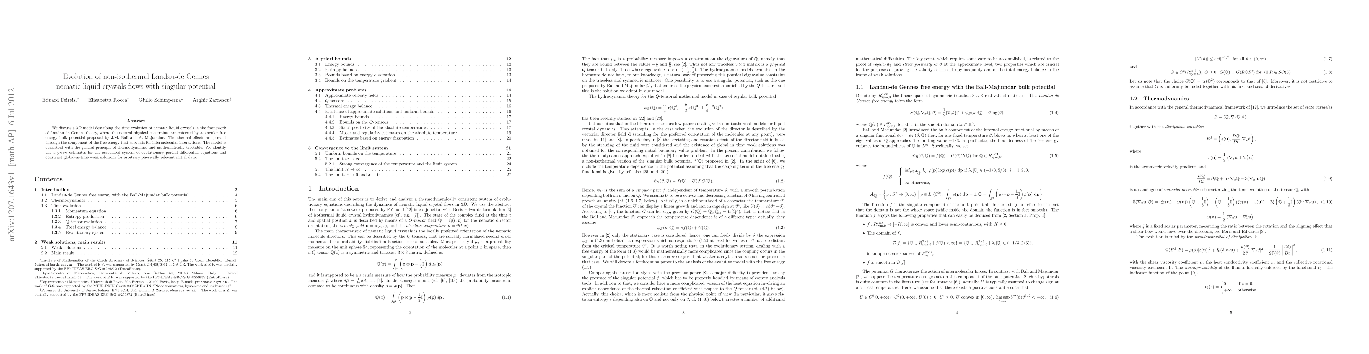 This research presents a 3D model for nematic liquid crystal flow evolution using Landau-de Gennes theory, incorporating a singular free energy potential for constraint enforcement. The model integrates thermal effects and adheres to thermodynamic principles, with a priori estimates for the PDE system and global-in-time weak solutions for arbitrary initial data.