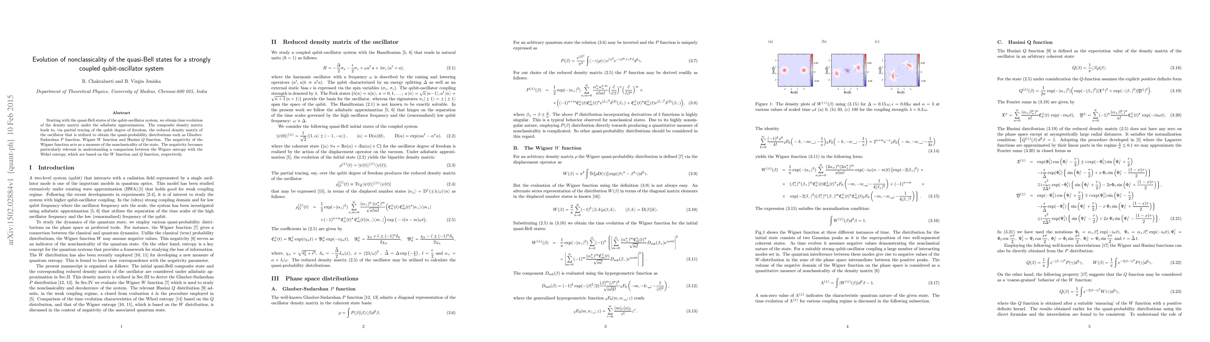 Starting with the quasi-Bell states of the qubit-oscillator system, we obtain time evolution of the density matrix under the adiabatic approximation. The composite density matrix leads to, via partial tracing of the qubit degree of freedom, the reduced density matrix of the oscillator that is utilized to obtain the quasi-probability distributions such as Glauber-Sudarshan P function, Wigner W function and Husimi Q function. The negativity of the Wigner function acts as a measure of the nonclassicality of the state. The negativity becomes particularly relevant in understanding a comparison between the Wigner entropy with the Wehrl entropy, which are based on the W function and Q function, respectively.