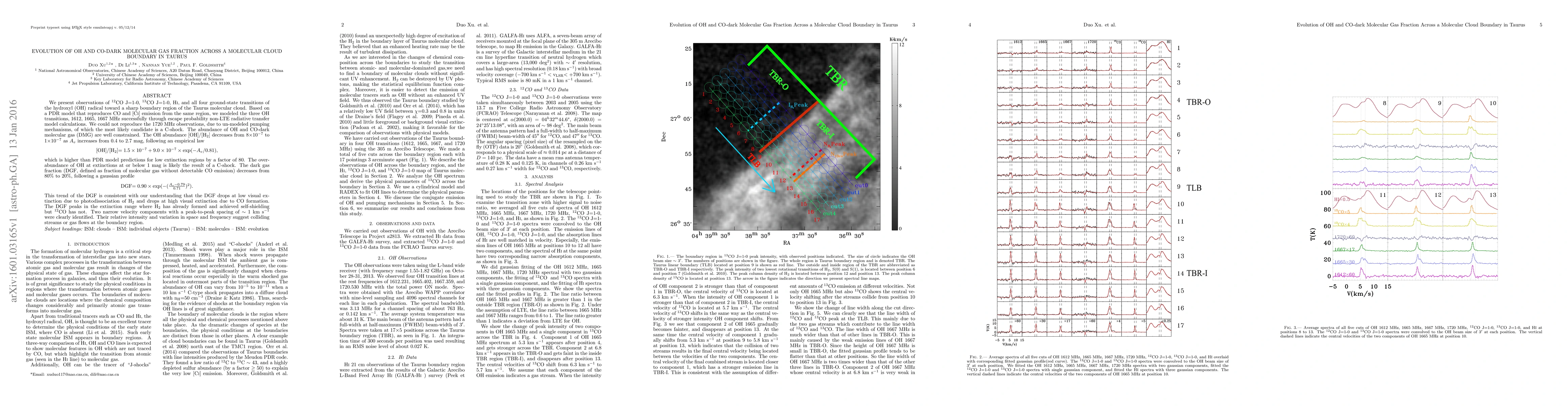 Researchers observed molecular gas in a Taurus cloud boundary using multiple spectroscopic transitions, finding that OH abundance increases with extinction due to C-shock, while dark gas fraction decreases with extinction, suggesting complex interactions between gas flows.