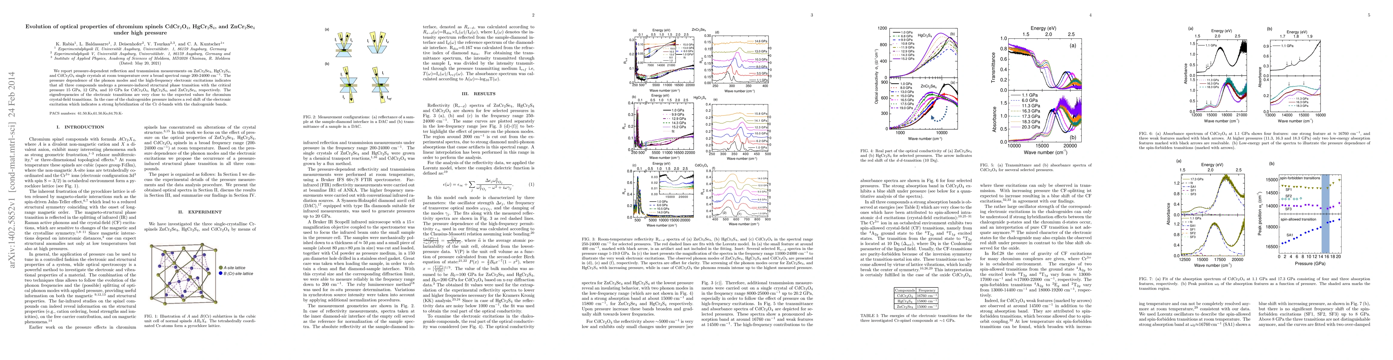 We report pressure-dependent reflection and transmission measurements on ZnCr$_2$Se$_4$, HgCr$_2$S$_4$, and CdCr$_2$O$_4$ single crystals at room temperature over a broad spectral range 200-24000 cm$^{-1}$. The pressure dependence of the phonon modes and the high-frequency electronic excitations indicates that all three compounds undergo a pressure-induced structural phase transition with the critical pressure 15 GPa, 12 GPa, and 10 GPa for CdCr$_2$O$_4$, HgCr$_2$S$_4$, and ZnCr$_2$Se$_4$, respectively. The eigenfrequencies of the electronic transitions are very close to the expected values for chromium crystal-field transitions. In the case of the chalcogenides pressure induces a red shift of the electronic excitation which indicates a strong hybridization of the Cr d-bands with the chalcogenide bands.