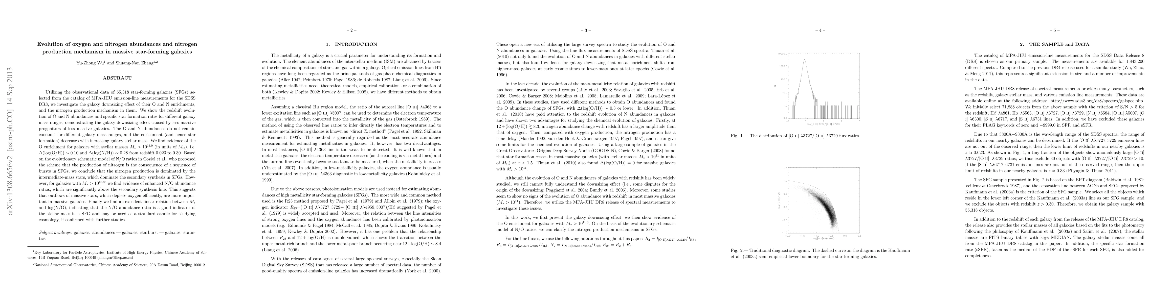 This paper examines the evolution of oxygen and nitrogen abundances in massive star-forming galaxies, revealing a galaxy downsizing effect where less massive galaxies show lower enrichment and star formation rates. It finds that nitrogen production is primarily driven by intermediate-mass stars, but massive galaxies exhibit enhanced N/O ratios due to oxygen depletion by outflows from massive stars, suggesting a potential use of N/O ratios as cosmological standard candles.
