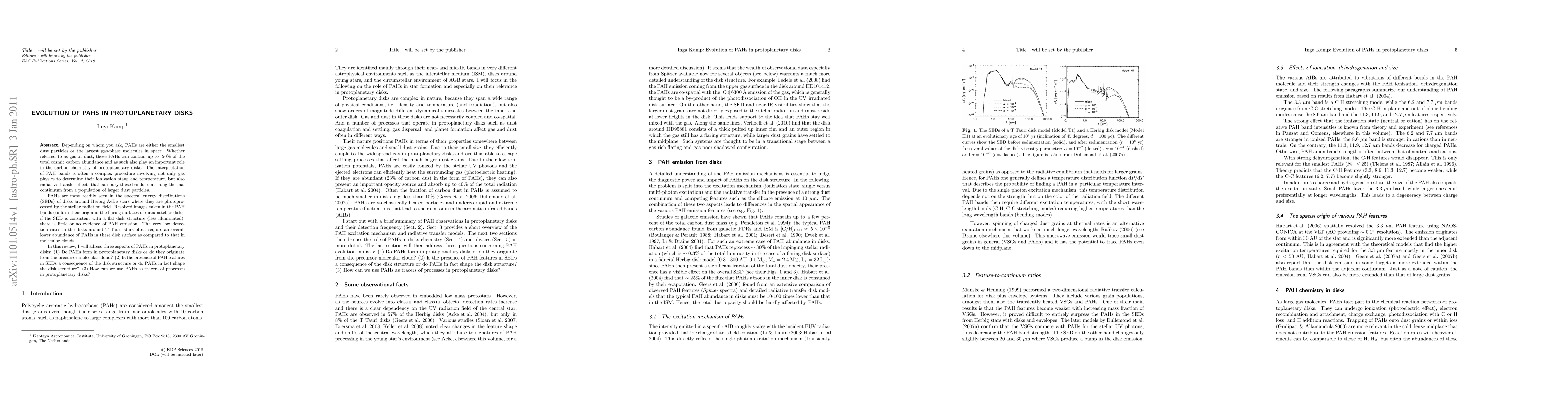 This paper reviews the evolution and role of polycyclic aromatic hydrocarbons (PAHs) in protoplanetary disks, focusing on their formation origins, influence on disk structure, and utility as tracers of disk processes. The study highlights the complexity of interpreting PAH bands due to gas physics and radiative transfer effects, and discusses their detection in the spectral energy distributions of Herbig AeBe stars.