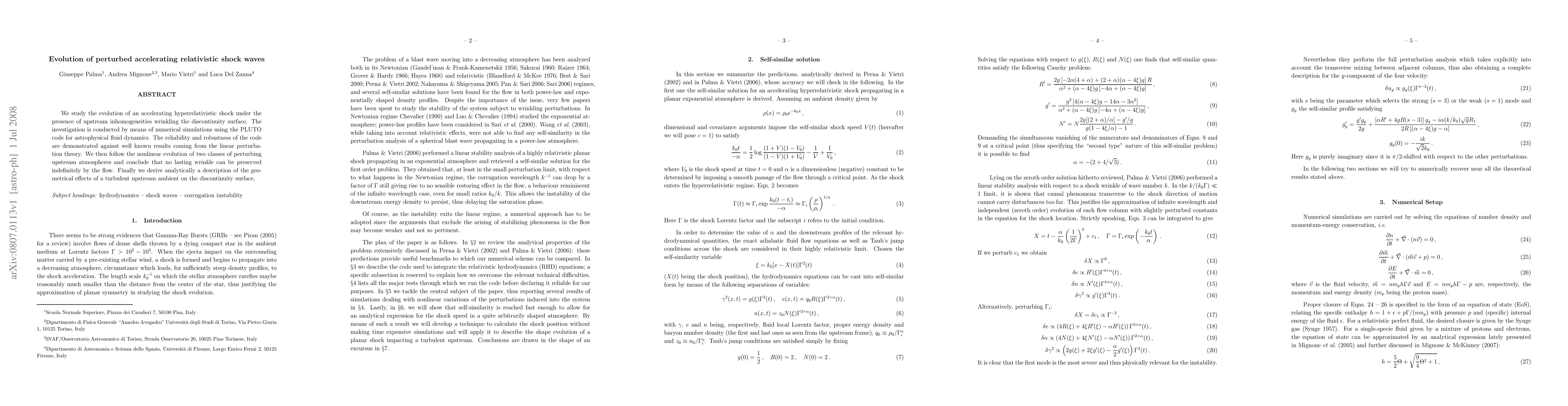 We study the evolution of an accelerating hyperrelativistic shock under the presence of upstream inhomogeneities wrinkling the discontinuity surface. The investigation is conducted by means of numerical simulations using the PLUTO code for astrophysical fluid dynamics. The reliability and robustness of the code are demonstrated against well known results coming from the linear perturbation theory. We then follow the nonlinear evolution of two classes of perturbing upstream atmospheres and conclude that no lasting wrinkle can be preserved indefinitely by the flow. Finally we derive analytically a description of the geometrical effects of a turbulent upstream ambient on the discontinuity surface.