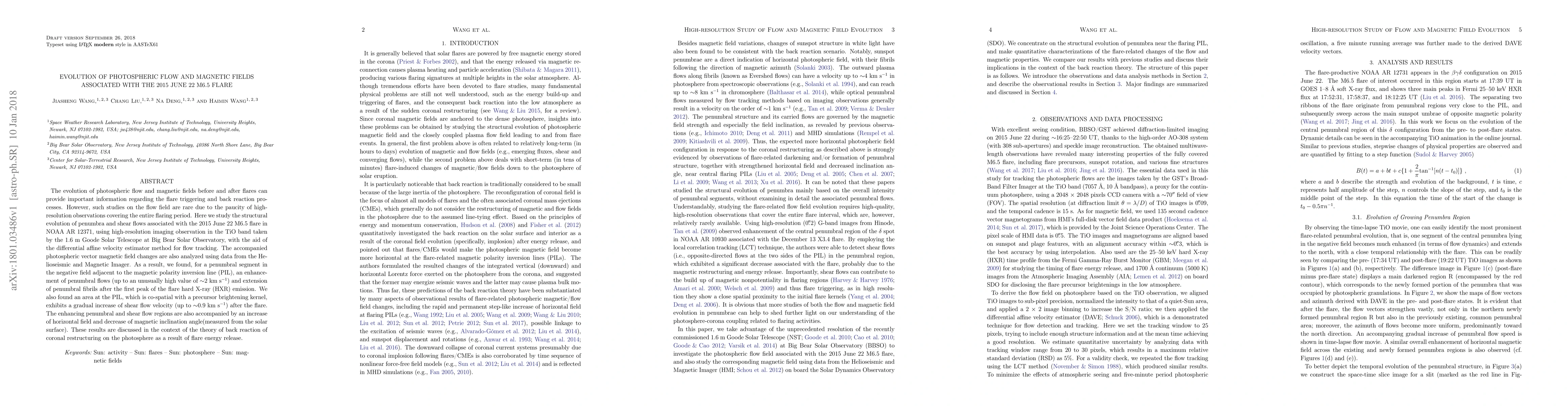 The evolution of photospheric flow and magnetic fields before and after flares can provide important information regarding the flare triggering and back reaction processes. However, such studies on the flow field are rare due to the paucity of high-resolution observations covering the entire flaring period. Here we study the structural evolution of penumbra and shear flows associated with the 2015 June 22 M6.5 flare in NOAA AR 12371, using high-resolution imaging observation in the TiO band taken by the 1.6~m Goode Solar Telescope at Big Bear Solar Observatory, with the aid of the differential affine velocity estimator method for flow tracking. The accompanied photospheric vector magnetic field changes are also analyzed using data from the Helioseismic and Magnetic Imager. As a result, we found, for a penumbral segment in the negative field adjacent to the magnetic polarity inversion line (PIL), an enhancement of penumbral flows (up to an unusually high value of \sm2~\kms) and extension of penumbral fibrils after the first peak of the flare hard X-ray (HXR) emission. We also found an area at the PIL, which is co-spatial with a precursor brightening kernel, exhibits a gradual increase of shear flow velocity (up to \sm0.9~\kms) after the flare. The enhancing penumbral and shear flow regions are also accompanied by an increase of horizontal field and decrease of magnetic inclination angle(measured from the solar surface). These results are discussed in the context of the theory of back reaction of coronal restructuring on the photosphere as a result of flare energy release.