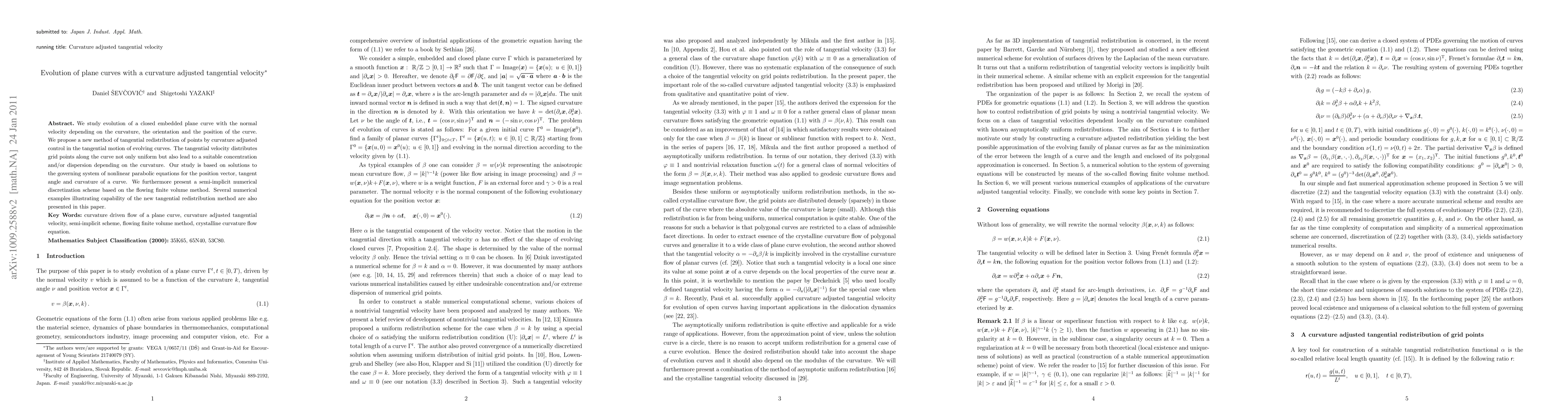 We study evolution of a closed embedded plane curve with the normal velocity depending on the curvature, the orientation and the position of the curve. We propose a new method of tangential redistribution of points by curvature adjusted control in the tangential motion of evolving curves. The tangential velocity distributes grid points along the curve not only uniform but also lead to a suitable concentration and/or dispersion depending on the curvature. Our study is based on solutions to the governing system of nonlinear parabolic equations for the position vector, tangent angle and curvature of a curve. We furthermore present a semi-implicit numerical discretization scheme based on the flowing finite volume method. Several numerical examples illustrating capability of the new tangential redistribution method are also presented in this paper.