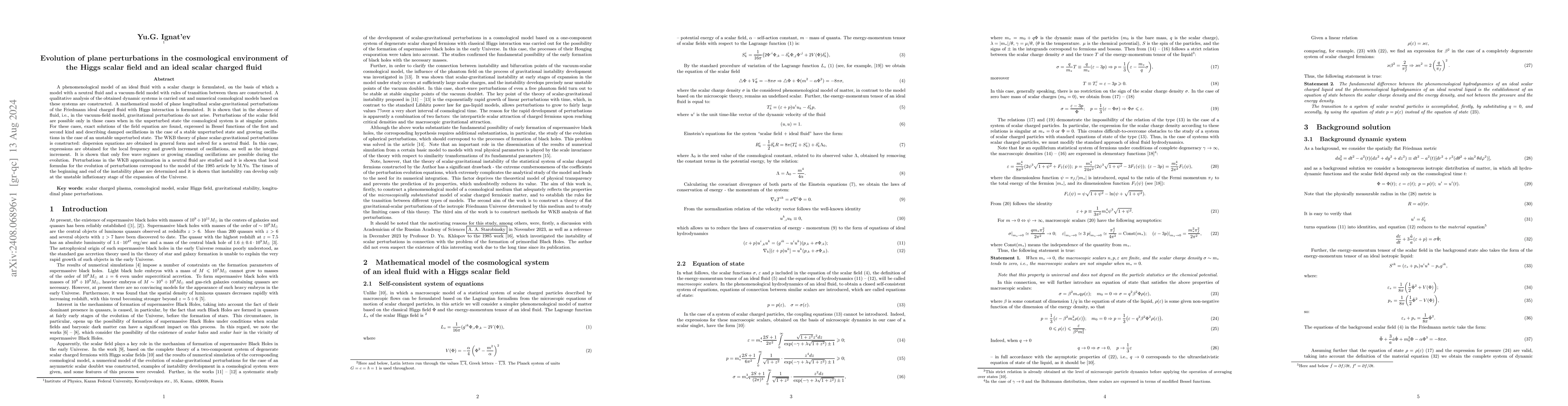 A phenomenological model of an ideal fluid with a scalar charge is formulated, on the basis of which a model with a neutral fluid and a vacuum-field model with rules of transition between them are constructed. A qualitative analysis of the obtained dynamic systems is carried out and numerical cosmological models based on these systems are constructed. A mathematical model of plane longitudinal scalar-gravitational perturbations of the Friedmann ideal charged fluid with Higgs interaction is formulated. It is shown that in the absence of fluid, i.e., in the vacuum-field model, gravitational perturbations do not arise. Perturbations of the scalar field are possible only in those cases when in the unperturbed state the cosmological system is at singular points. For these cases, exact solutions of the field equation are found, expressed in Bessel functions of the first and second kind and describing damped oscillations in the case of a stable unperturbed state and growing oscillations in the case of an unstable unperturbed state. The WKB theory of plane scalar-gravitational perturbations is constructed: dispersion equations are obtained in general form and solved for a neutral fluid. In this case, expressions are obtained for the local frequency and growth increment of oscillations, as well as the integral increment. It is shown that only free wave regimes or growing standing oscillations are possible during the evolution. Perturbations in the WKB approximation in a neutral fluid are studied and it is shown that local formulas for the evolution of perturbations correspond to the model of the 1985 article by M.Yu. The times of the beginning and end of the instability phase are determined and it is shown that instability can develop only at the unstable inflationary stage of the expansion of the Universe.