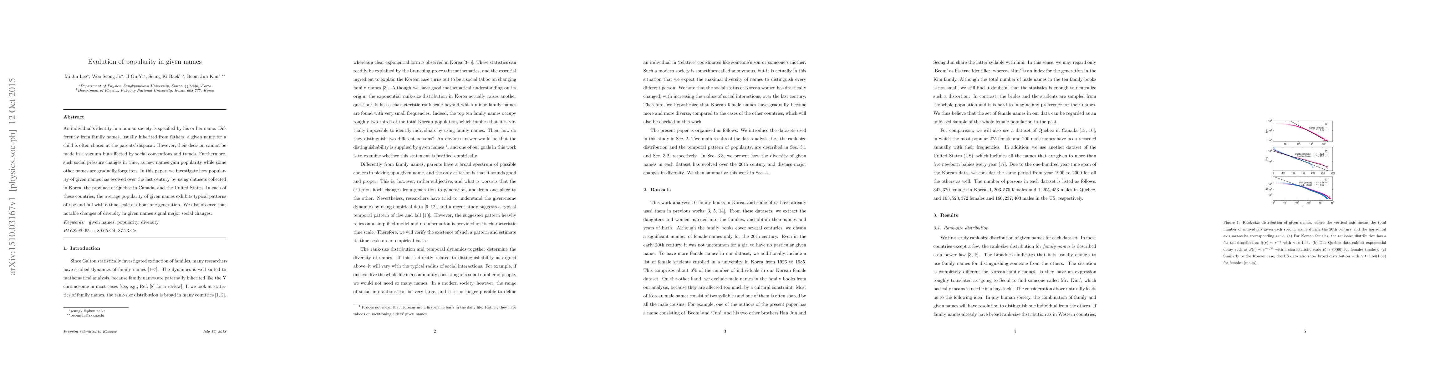 An individual's identity in a human society is specified by his or her name. Differently from family names, usually inherited from fathers, a given name for a child is often chosen at the parents' disposal. However, their decision cannot be made in a vacuum but affected by social conventions and trends. Furthermore, such social pressure changes in time, as new names gain popularity while some other names are gradually forgotten. In this paper, we investigate how popularity of given names has evolved over the last century by using datasets collected in Korea, the province of Quebec in Canada, and the United States. In each of these countries, the average popularity of given names exhibits typical patterns of rise and fall with a time scale of about one generation. We also observe that notable changes of diversity in given names signal major social changes.