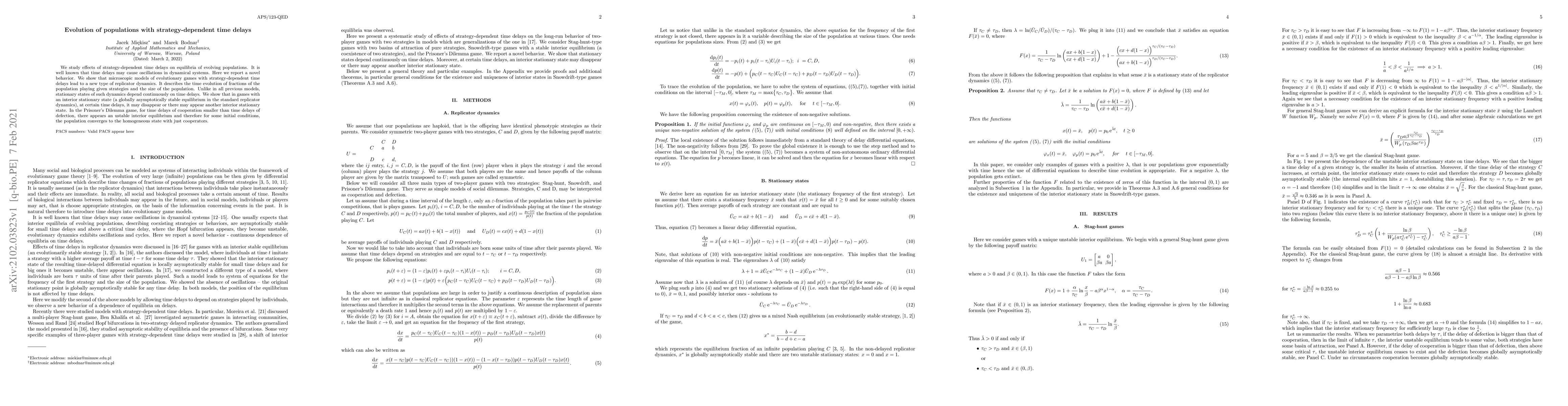 This paper investigates how strategy-dependent time delays affect the equilibria in evolving populations, revealing a novel type of replicator dynamics where stationary states depend continuously on time delays. It demonstrates that such delays can cause the disappearance or emergence of interior stationary states, leading to unexpected outcomes in games like the Prisoner's Dilemma.