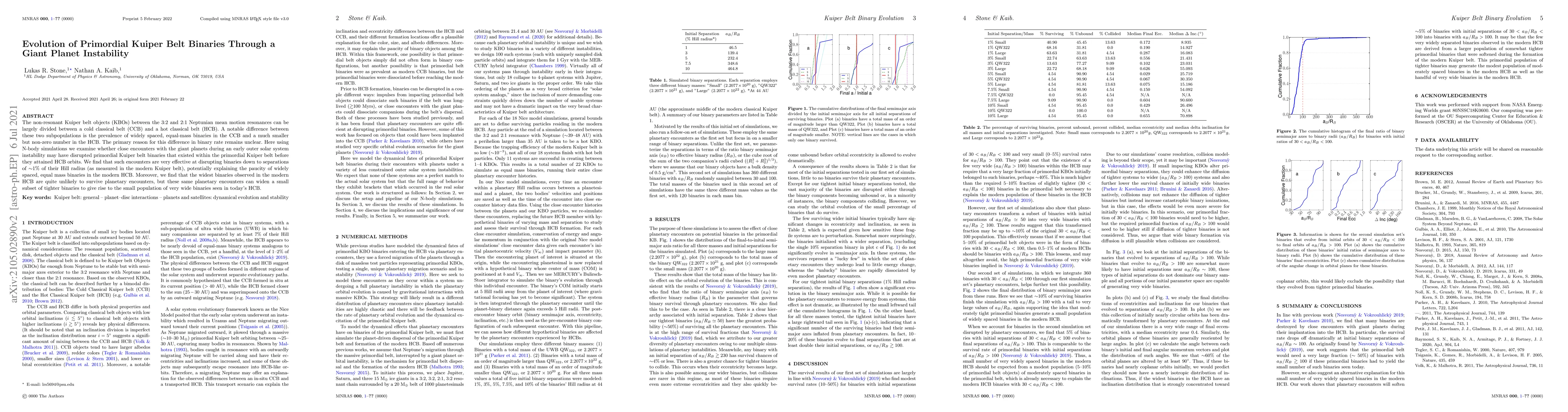 This paper investigates how encounters with giant planets during an early solar system instability disrupted primordial Kuiper Belt binaries, explaining the lower binary rate in the hot classical belt. Simulations show that such encounters can disrupt binaries and widen a subset of tighter binaries, resulting in the observed population of binaries in the modern Kuiper belt.