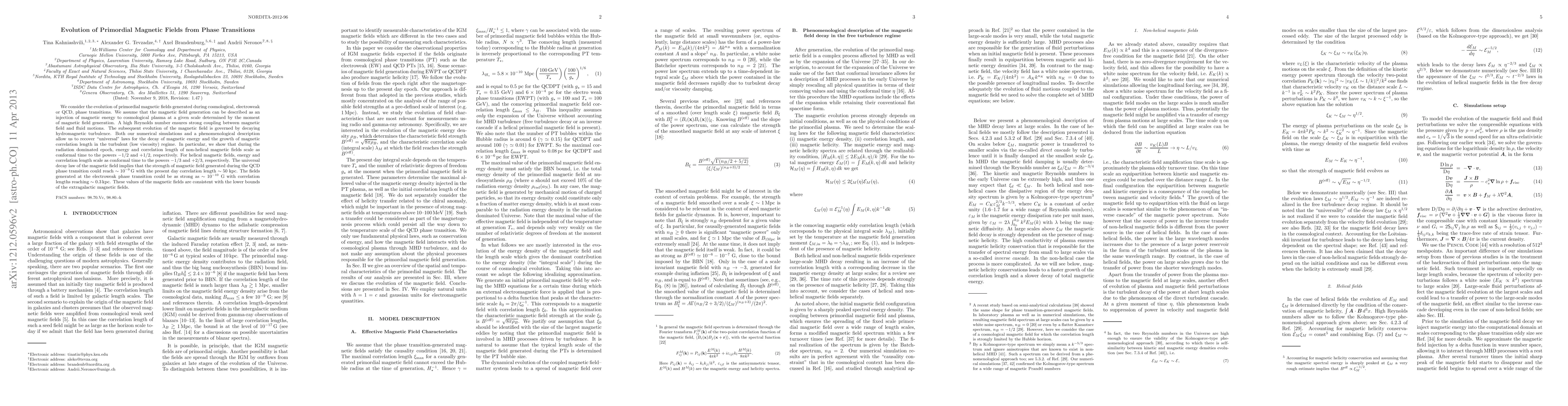 This paper investigates the evolution of primordial magnetic fields generated during cosmological phase transitions, showing that turbulent decay follows universal laws. It predicts magnetic field strengths and correlation lengths for fields generated during QCD and electroweak transitions, consistent with observed extragalactic magnetic fields.
