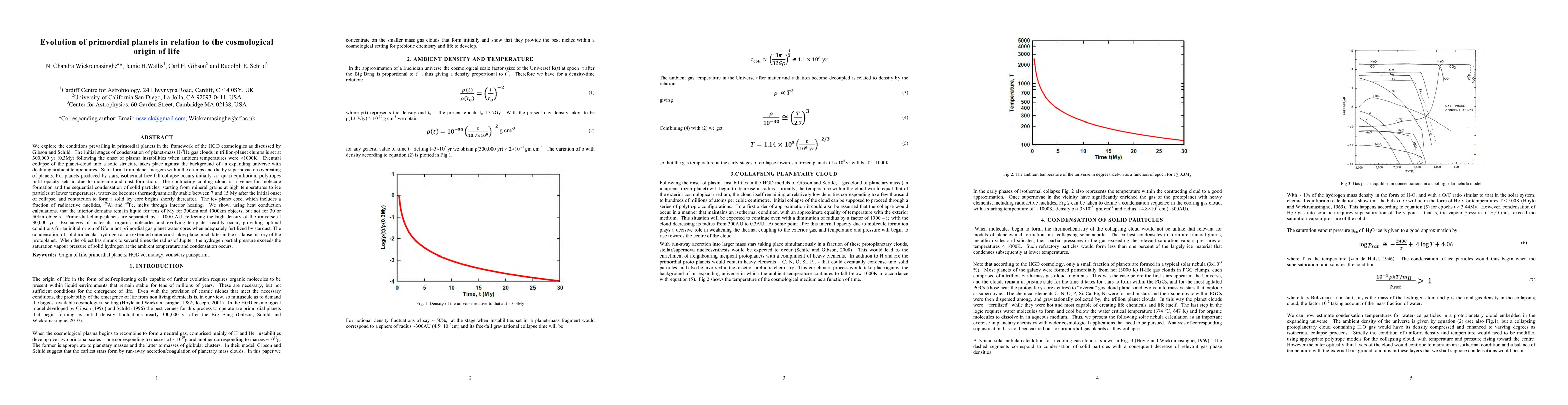 We explore the conditions prevailing in primordial planets in the framework of the HGD cosmologies as discussed by Gibson and Schild. The initial stages of condensation of planet-mass H-4He gas clouds in trillion-planet clumps is set at 300,000 yr (0.3My) following the onset of plasma instabilities when ambient temperatures were >1000K. Eventual collapse of the planet-cloud into a solid structure takes place against the background of an expanding universe with declining ambient temperatures. Stars form from planet mergers within the clumps and die by supernovae on overeating of planets. For planets produced by stars, isothermal free fall collapse occurs initially via quasi equilibrium polytropes until opacity sets in due to molecule and dust formation. The contracting cooling cloud is a venue for molecule formation and the sequential condensation of solid particles, starting from mineral grains at high temperatures to ice particles at lower temperatures, water-ice becomes thermodynamically stable between 7 and 15 My after the initial onset of collapse, and contraction to form a solid icy core begins shortly thereafter. Primordial-clump-planets are separated by ~ 1000 AU, reflecting the high density of the universe at 30,000 yr. Exchanges of materials, organic molecules and evolving templates readily occur, providing optimal conditions for an initial origin of life in hot primordial gas planet water cores when adequately fertilized by stardust. The condensation of solid molecular hydrogen as an extended outer crust takes place much later in the collapse history of the protoplanet. When the object has shrunk to several times the radius of Jupiter, the hydrogen partial pressure exceeds the saturation vapour pressure of solid hydrogen at the ambient temperature and condensation occurs.