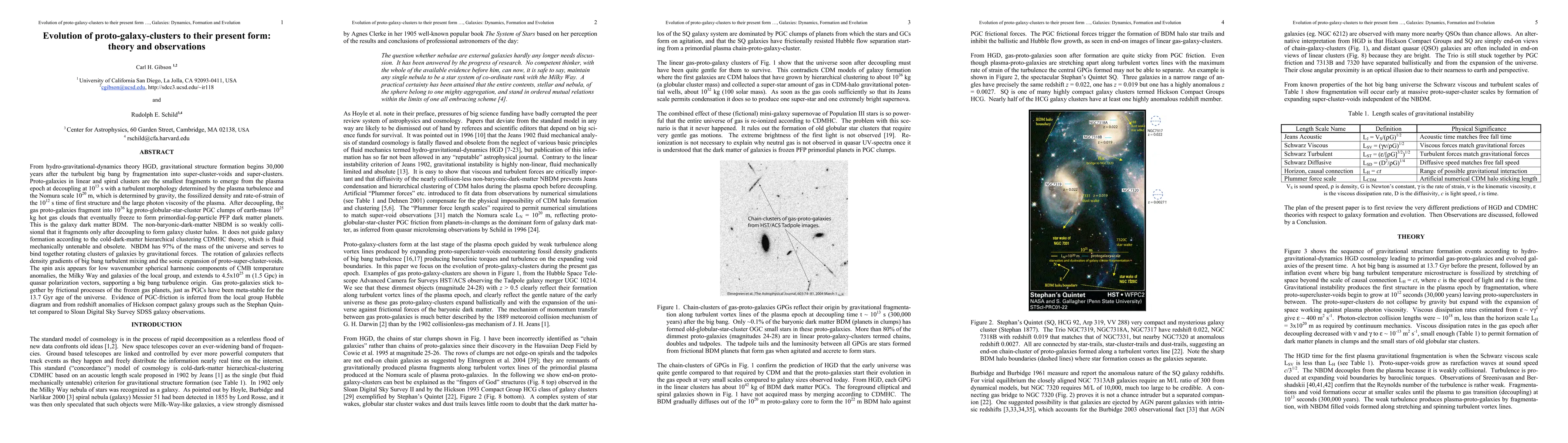 From hydro-gravitational-dynamics theory HGD, gravitational structure formation begins 30,000 years after the turbulent big bang by fragmentation into super-cluster-voids and super-clusters. Proto-galaxies in linear and spiral clusters are the smallest fragments to emerge from the plasma epoch at decoupling at 10^13 s with a turbulent morphology determined by the plasma turbulence and the Nomura scale 10^20 m, which is determined by gravity, the fossilized density and rate-of-strain of the 10^12 s time of first structure and the large photon viscosity of the plasma. After decoupling, the gas proto-galaxies fragment into 10^36 kg proto-globular-star-cluster PGC clumps of earth-mass 10^25 kg hot gas clouds that eventually freeze to form primordial-fog-particle PFP dark matter planets. The rotation of galaxies reflects density gradients of big bang turbulent mixing and the sonic expansion of proto-super-cluster-voids. The spin axis appears for low wavenumber spherical harmonic components of CMB temperature anomalies, the Milky Way and galaxies of the local group, and extends to 4.5x10^25 m (1.5 Gpc) in quasar polarization vectors, supporting a big bang turbulence origin. Gas proto-galaxies stick together by frictional processes of the frozen gas planets, just as PGCs have been meta-stable for the 13.7 Gyr age of the universe. Evidence of PGC-friction is inferred from the local group Hubble diagram and from redshift anomalies of Hickson compact galaxy groups such as the Stephan Quintet compared to Sloan Digital Sky Survey SDSS galaxy observations.