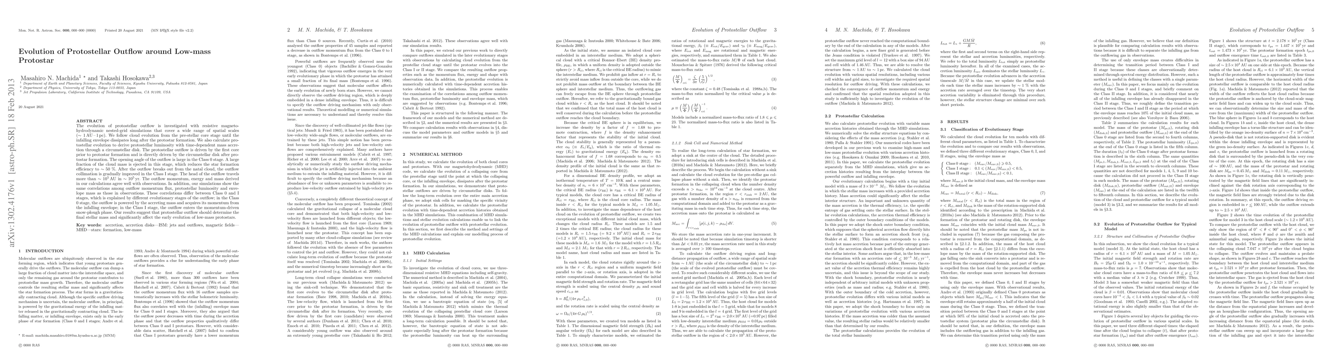 This paper investigates the evolution of protostellar outflows around low-mass protostars using resistive magneto-hydrodynamic simulations. The study finds that outflows are driven by the first core and later by the circumstellar disk, with significant mass ejection in the Class 0 stage reducing star formation efficiency. The outflow collimation and dynamics correlate with protostellar luminosity and envelope mass, differing between Class 0 and I stages due to varying outflow mechanisms.