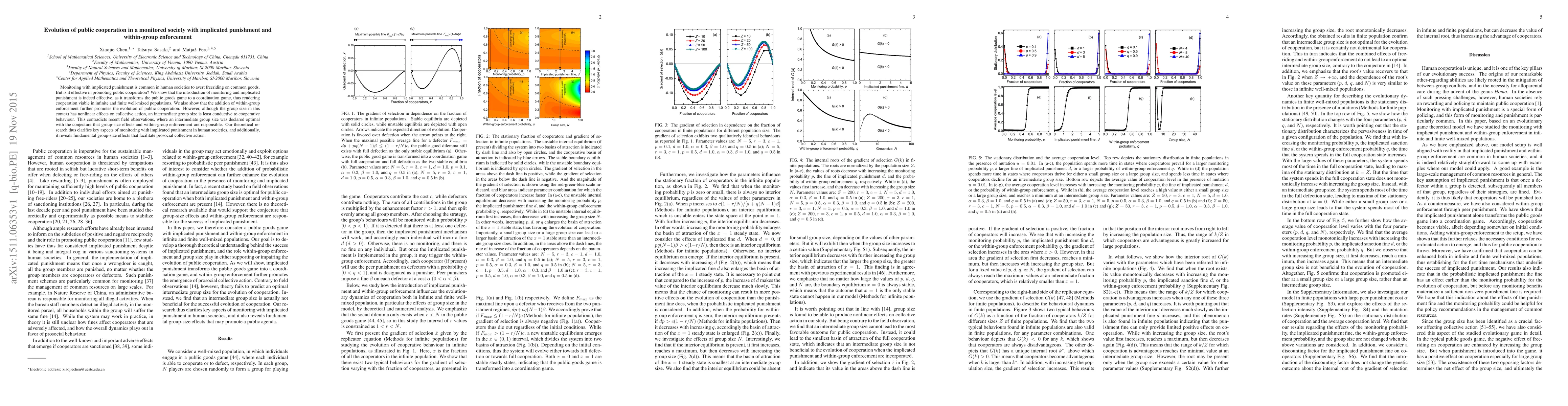 Monitoring with implicated punishment is common in human societies to avert freeriding on common goods. But is it effective in promoting public cooperation? We show that the introduction of monitoring and implicated punishment is indeed effective, as it transforms the public goods game to a coordination game, thus rendering cooperation viable in infinite and finite well-mixed populations. We also show that the addition of within-group enforcement further promotes the evolution of public cooperation. However, although the group size in this context has nonlinear effects on collective action, an intermediate group size is least conductive to cooperative behaviour. This contradicts recent field observations, where an intermediate group size was declared optimal with the conjecture that group-size effects and within-group enforcement are responsible. Our theoretical research thus clarifies key aspects of monitoring with implicated punishment in human societies, and additionally, it reveals fundamental group-size effects that facilitate prosocial collective action.
