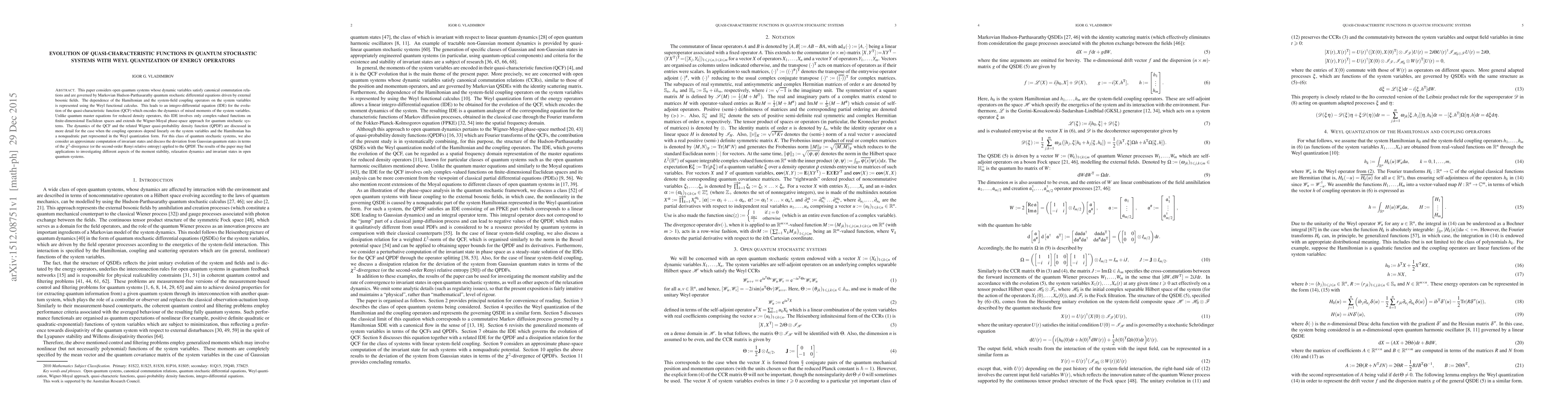 This paper explores the evolution of quasi-characteristic functions in quantum stochastic systems governed by Hudson-Parthasarathy equations, using Weyl quantization for Hamiltonian and coupling operators. It derives an integro-differential equation for the quasi-characteristic function, which extends the Wigner-Moyal approach, and discusses its dynamics and applications to moment stability and relaxation in open quantum systems.